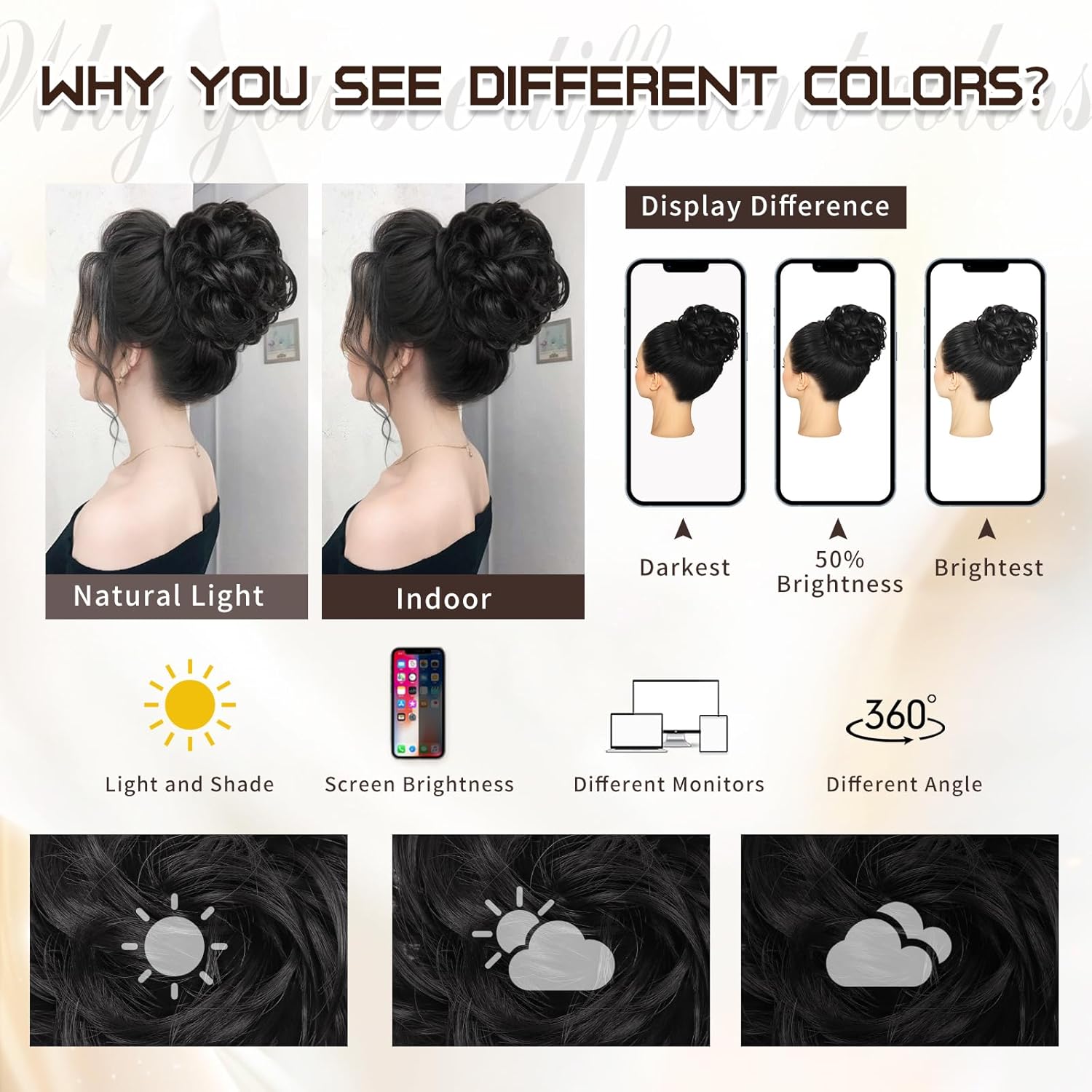 Tips: Due to different monitors’ lights and color differences, hair bun may be some color difference between the picture and the actual product. If you have any problems with our hairpiece bun, please contact us at any time.