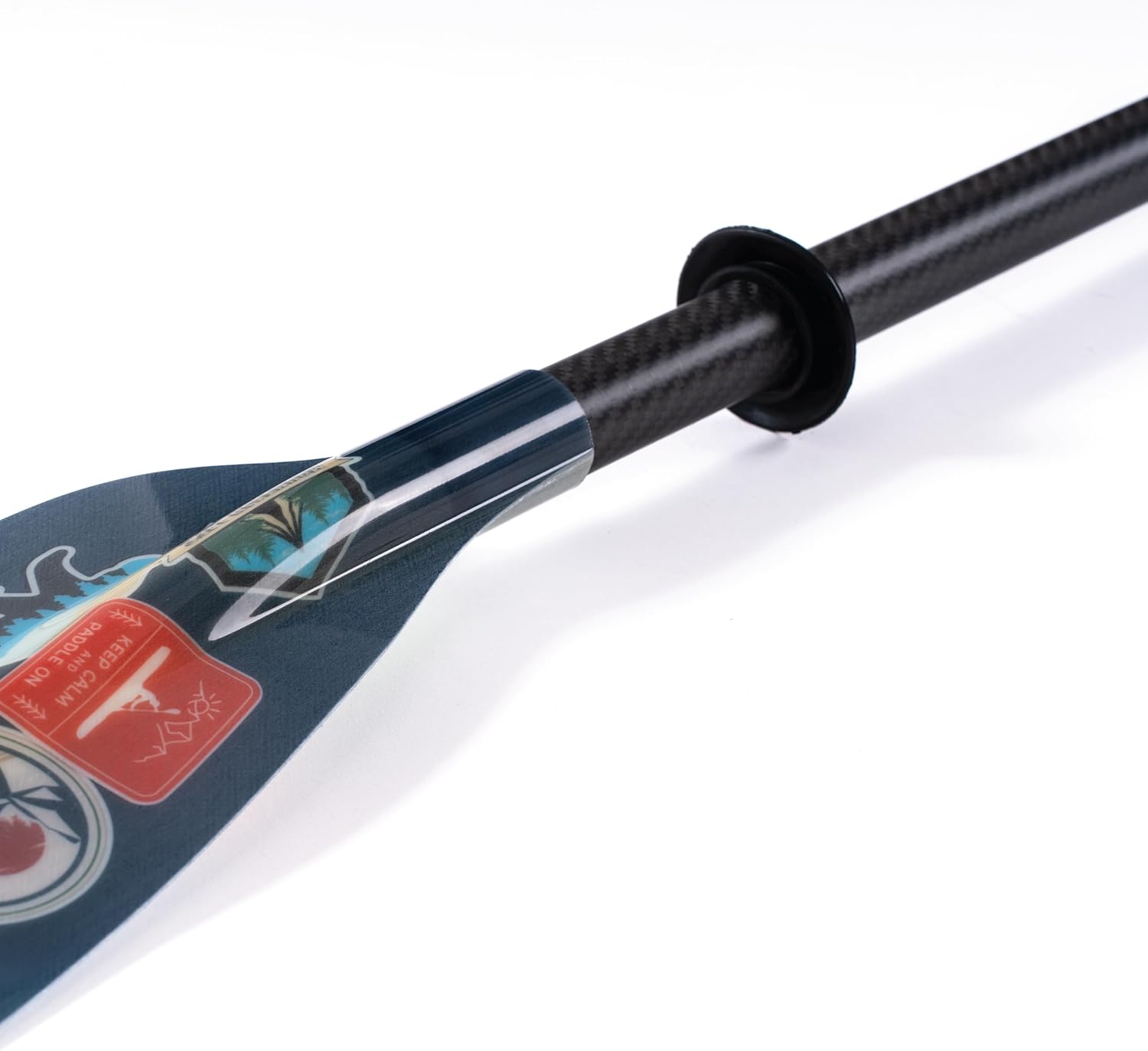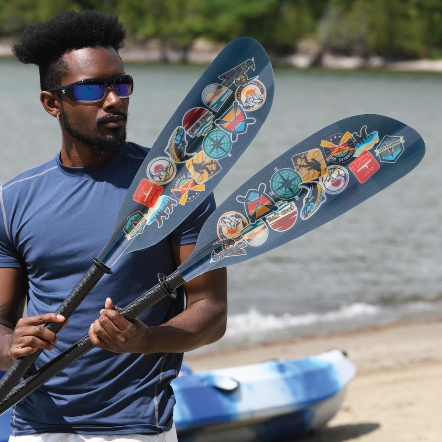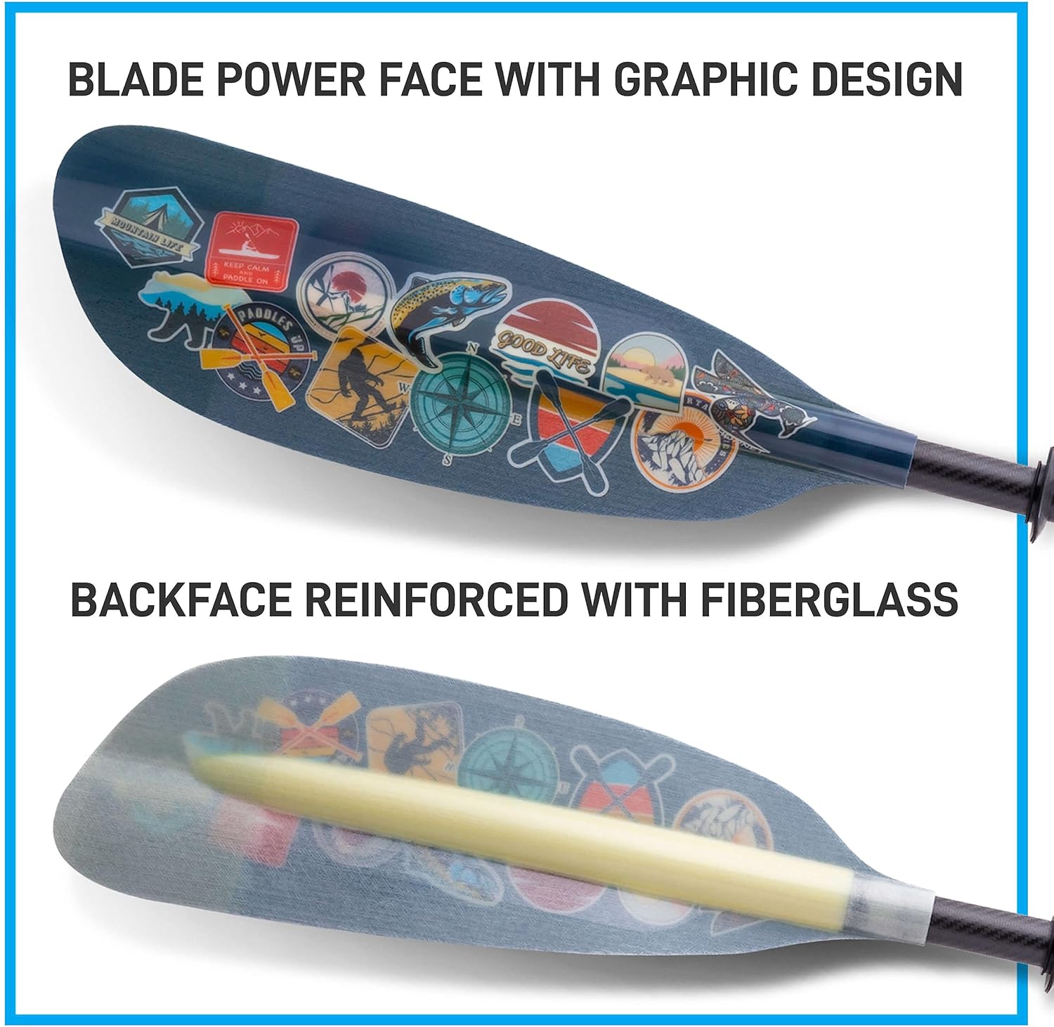 GRAPHIC DESIGN: The blade’s power face has a sticker adventure design, which shows through on the blade’s transparent backface. The other side is reinforced with fiberglass for maximum durability and a sleek look. The dihedral blade shape is ideal for efficiently pulling water.