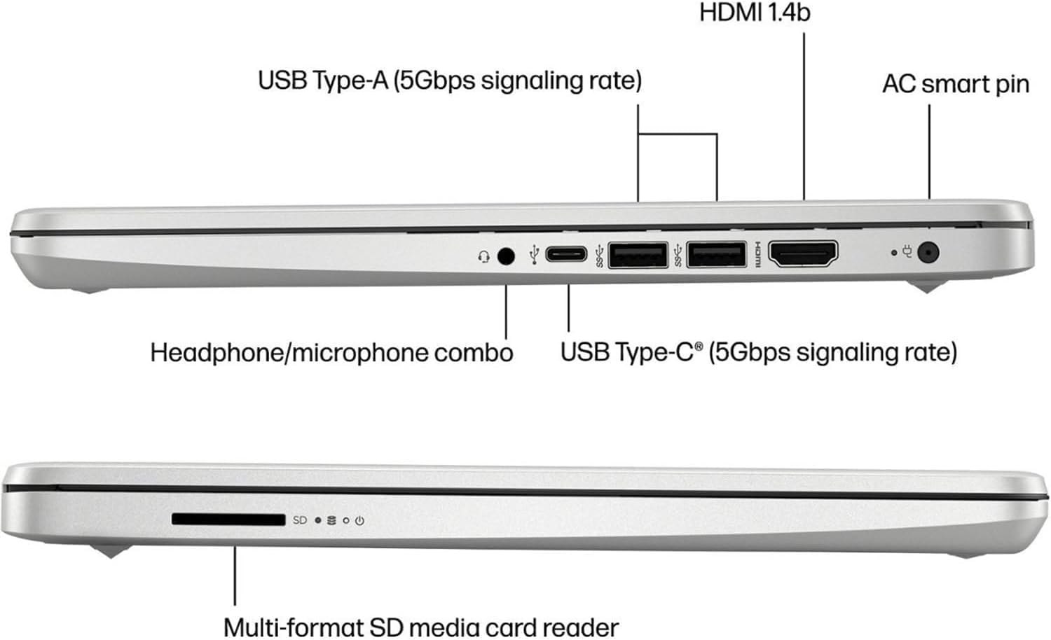 Processor: Intel Pentium Silver N5030 (4 cores, 4 threads, up to 3.1 GHz) Graphics: Intel UHD Graphics Operating system:Windows 11 64-bit Memory: Up to 32GB DDR4 SDRAM Hard Drive: Up to 2.5TB Storage (2TB Solid State Drive (SSD) + 512GB External Hard Drive) Optical Drive: No Display: 14-inch diagonal, HD (1366 x 768), micro-edge, BrightView, 220 nits, 45% NTSC Connectivity: Realtek RTL8821CE 802.11a/b/g/n/ac (1×1) Wi-Fi and Bluetooth 4.2 combo Audio: Dual Speakers Keyboard: US English, NonBacklit Full Size Keyboard Built-in HD Webcam: HP True Vision 720p HD camera with dual array microphones Media Drive: Multi-format SD media card reader Ports: 1 x USB 3.1 Gen 1 Type-C (Data Transfer Only, 5 Gb/s signaling rate) 2 x USB 3.1 Gen 1 Type-A (Data Transfer Only) 1 x AC smart pin 1 x HDMI 1.4b 1 x Headphone / Mic Combo Jack Battery: Up to 11.5 Hours Color: Natural Silver Dimensions L x W x H (inches): 12.76 x 8.86 x 0.71 Weight: 3.24 lbs Accessories: 512GB External Hard Drive Microfiber Cloth Hotkey Sticker