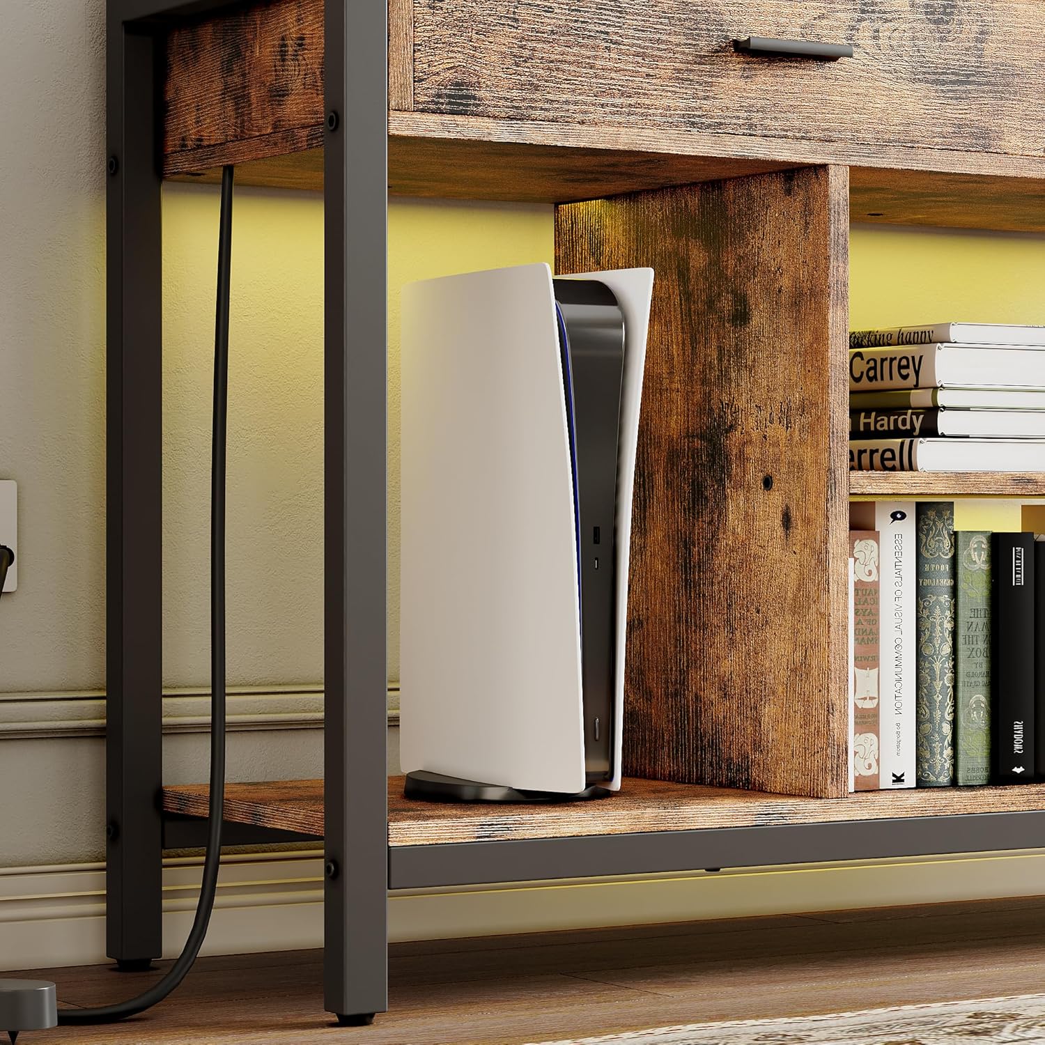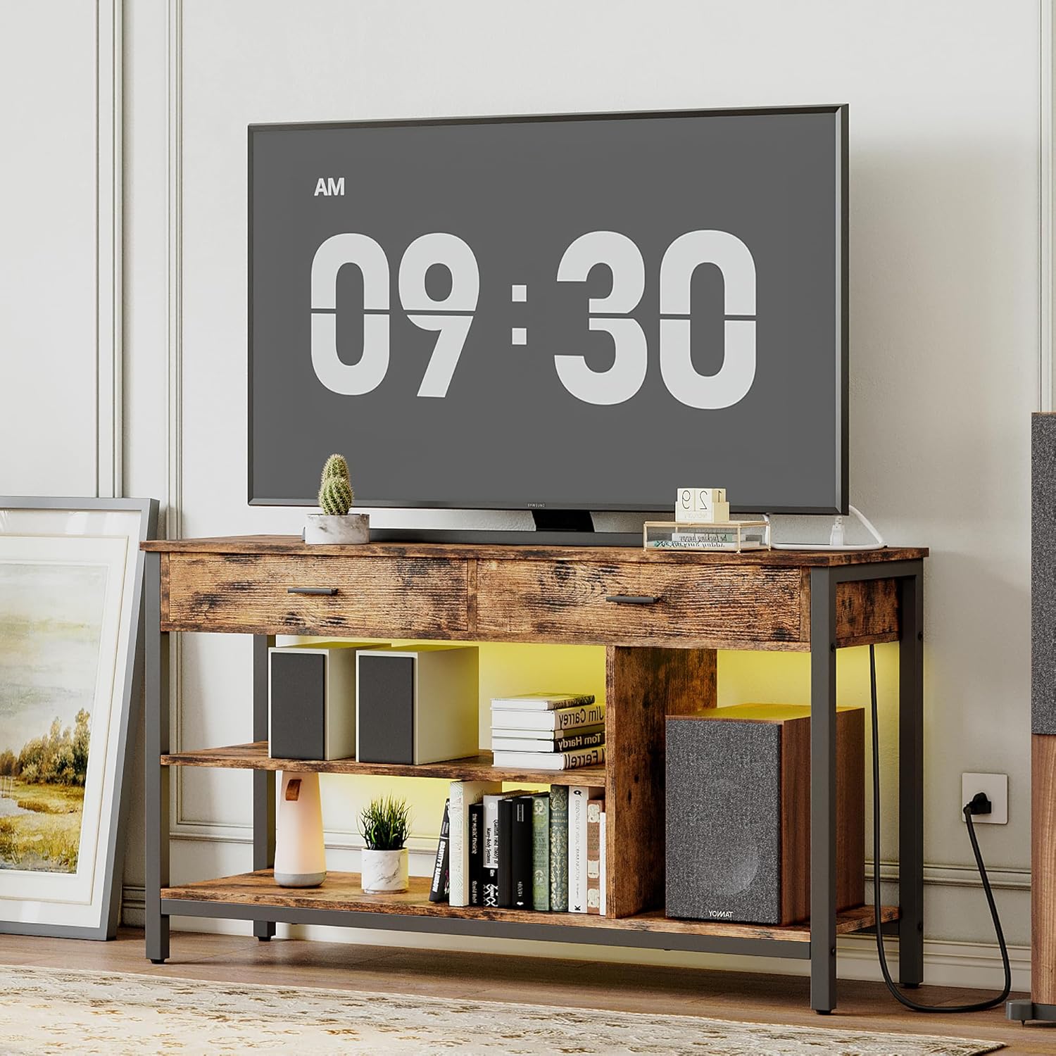IRONCK TV Stand LED Lights, Entertainment Center with Power Outlet for 55 Inch TV, Industrial TV Console with Media Storage Shelf and 2 Large Drawers,for Bedroom/Living Room, Vintage Brown