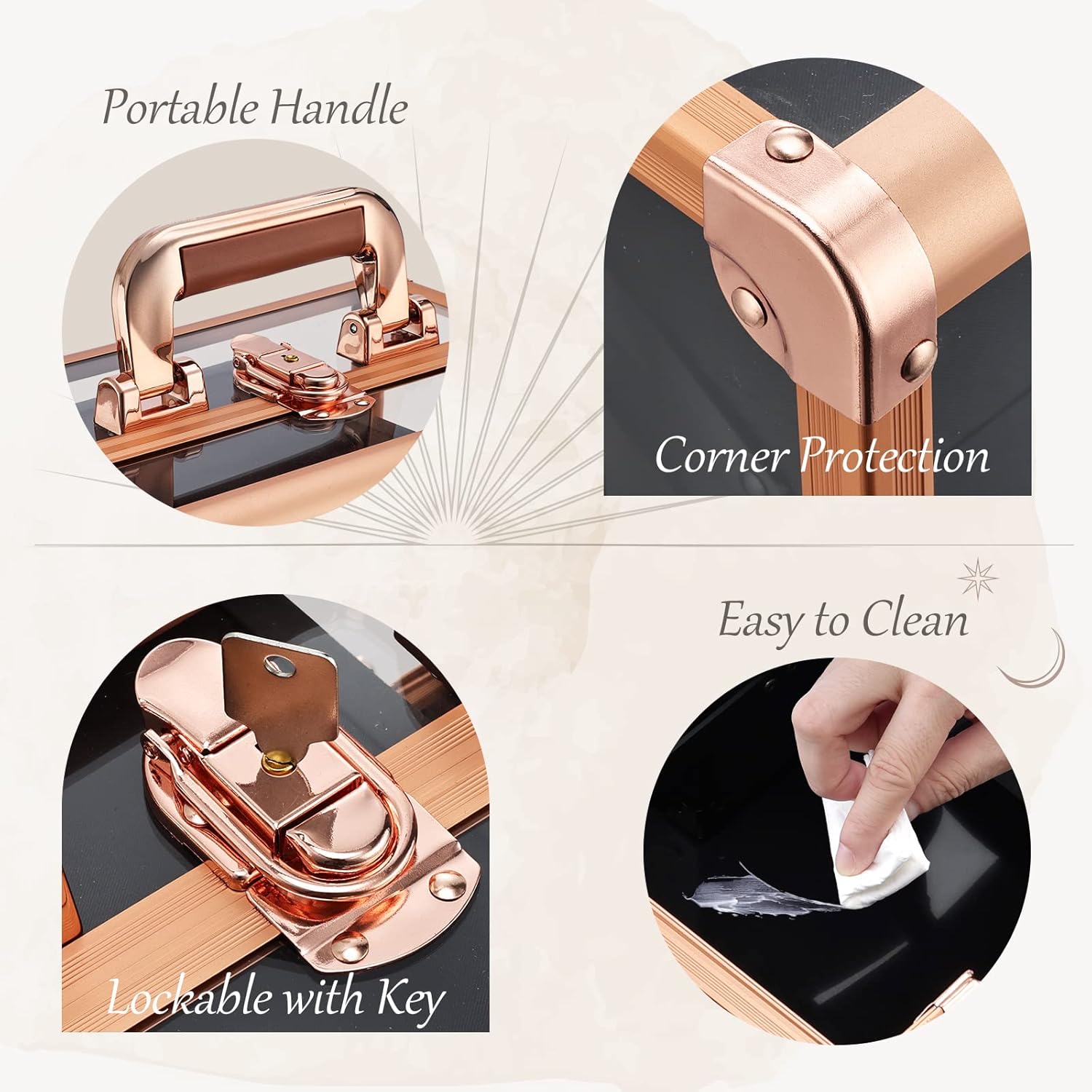 Portable & Lockable: This Joligrace cosmetic train case constructed out of lightweight yet durable material is in a 10 inch portable size with large convenient non-slip & comfortable grip handle attached. It is also lockable with key for privacy and security, ideal for bringing your cosmetics with you when you travel as well as providing ample space to store your daily makeup needs.