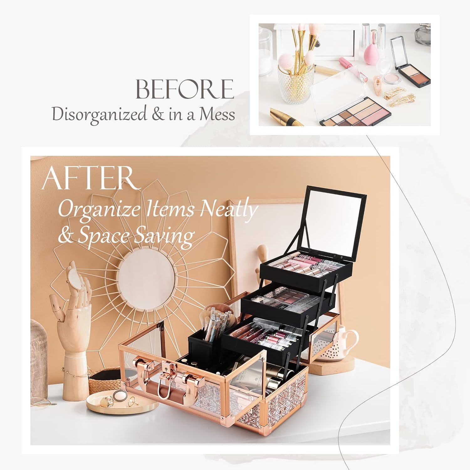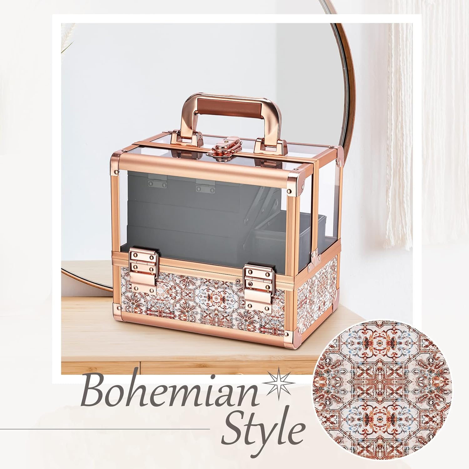 Pretty Acrylic Bohemian Style: The makeup case comes in a Bohemian style matched with clear acrylic which gives an impressive display effect. The inner component has been carefully matched in color. This makes a great cometic organizer or display case.
