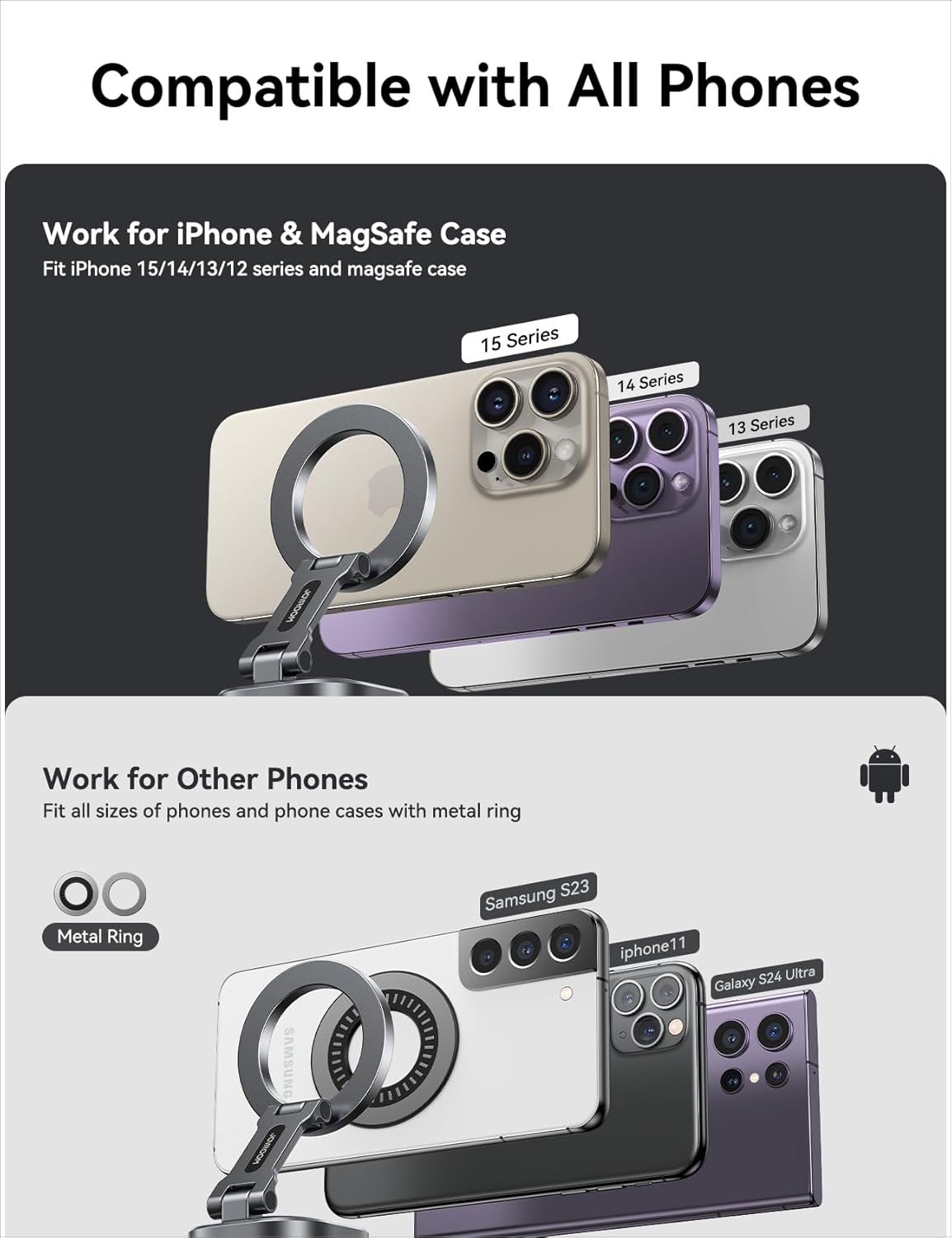 [ Works for All Phones ] JOYROOM magsafe car mount works directly on iPhone 15/14/13/12 series or with any MagSafe-supported phone cases. If your phone or case does not have MagSafe function, it can also be used with the included magnetic sheet, affixed to the back of a regular phone case, making it suitable for use with all phones, including Apple, Samsung, HTC, Google, and more.