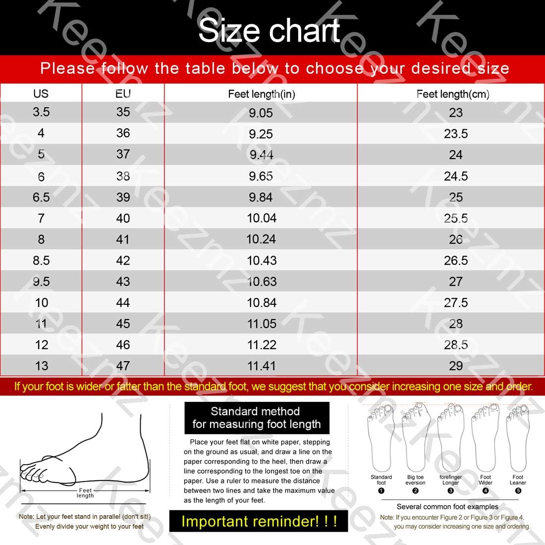 Below it will help us choose right size for shoes, compare the chart size with your feet length carefully before ordering.If your foot is wider or fatter than the standard foot, we suggest that you consider increasing one size and order.Thank you!