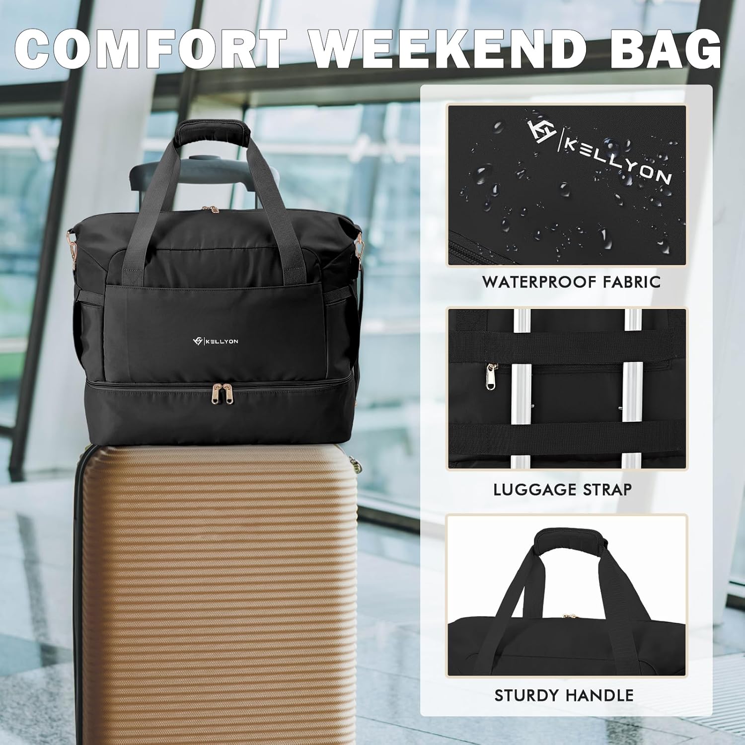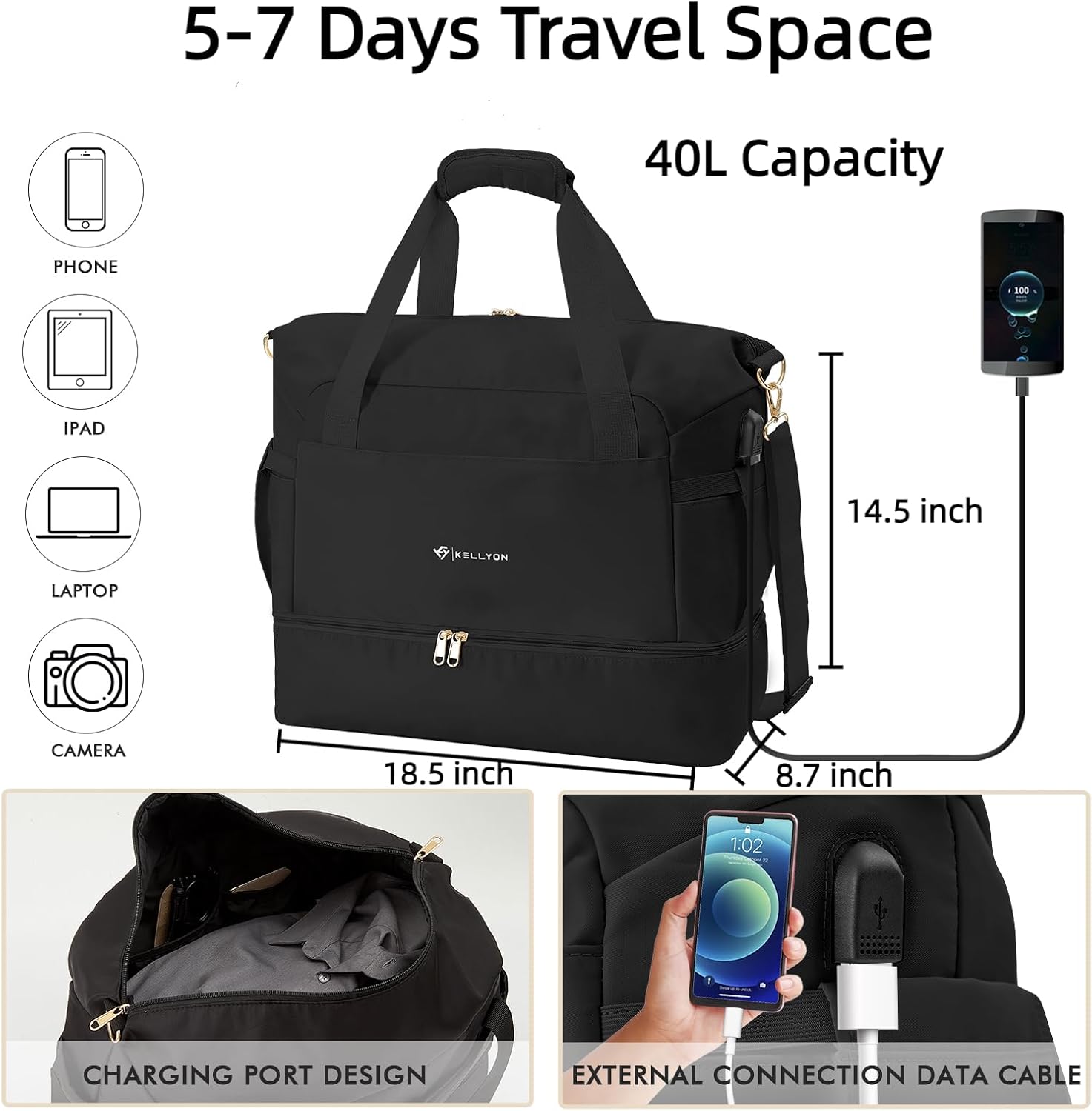 Kellyon Large Travel Duffle Bag for Women Men, Weekender Bags with Shoe Compartment Overnight Bags with USB Charging Port, Waterproof Sports Gym Bag, Carry On Luggage Duffel Bag Black