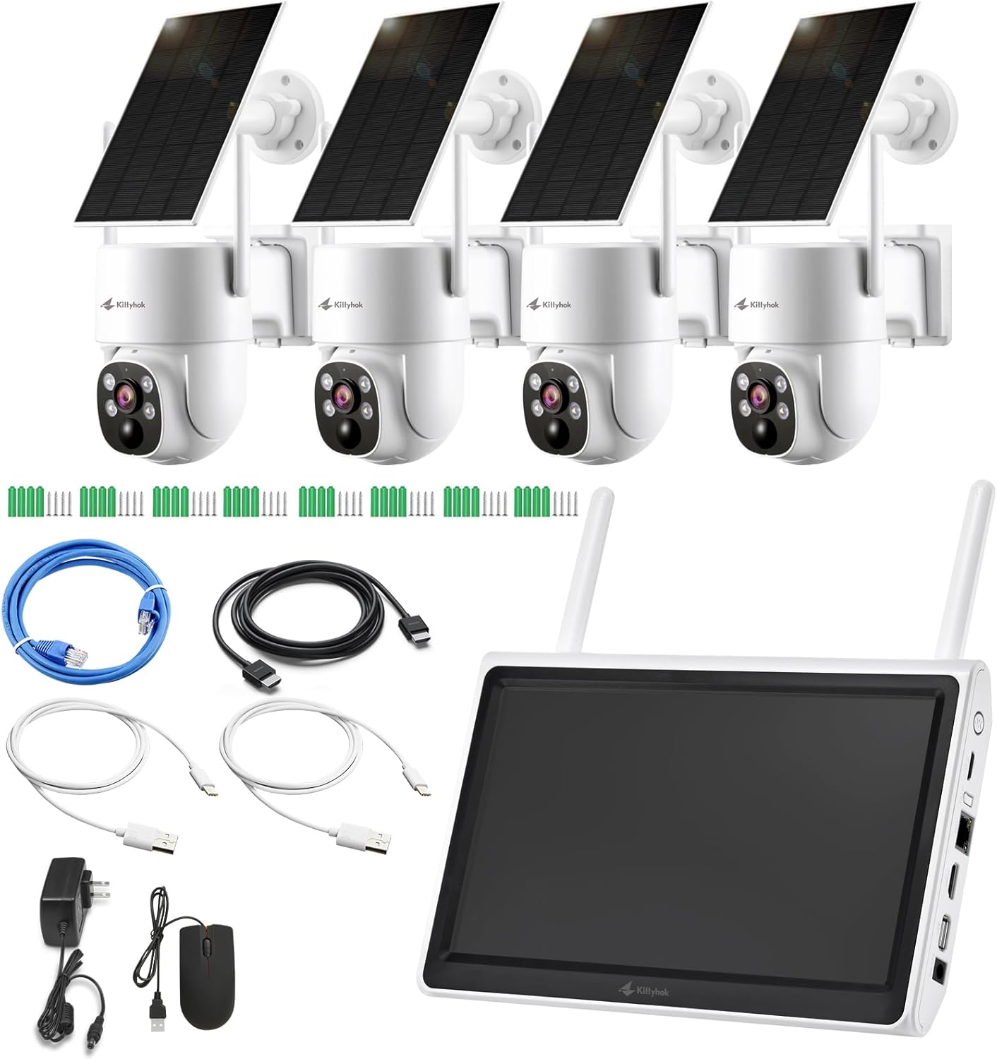 Kittyhok Outdoor Solar Security Camera System Wireless | 4pcs 2K Solar PTZ Security Camera, Pro Color Night Vision, Human Detection, 360 Viewing | 10CH NVR with 10” HD Monitor, 60 Days Local Storage