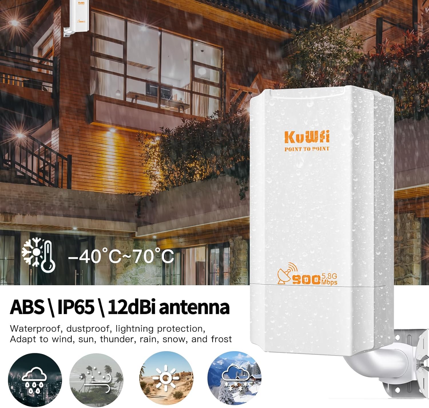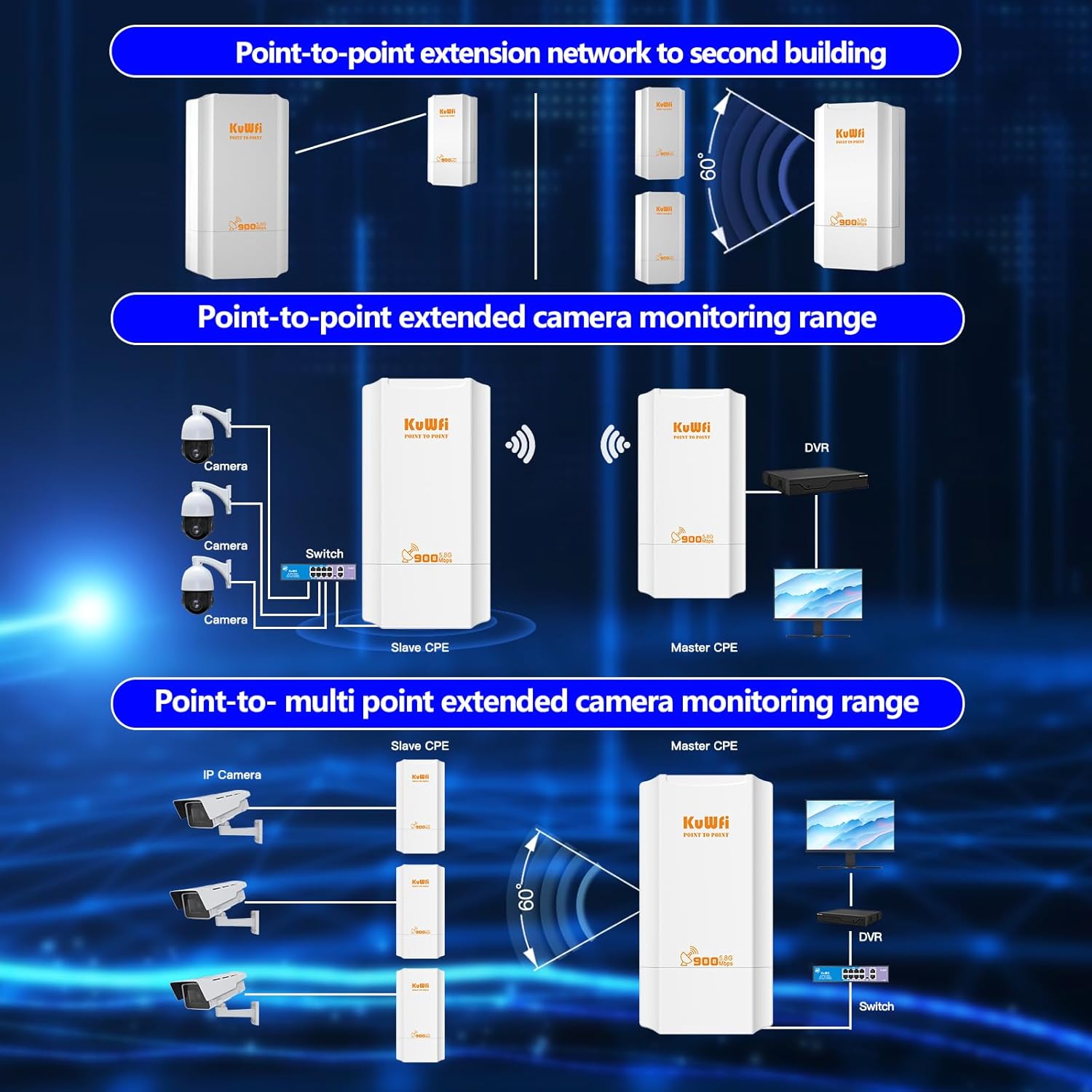 【2KM Wireless Bridge Transmission Distance】Wireless bridge point to point outdoor built-in 12dBi High-gain antenna, it provides up to 900Mbps wireless speeds, PTP WiFi distance up to 2000 meters(barrier-free), which significantly improves the coverage and WiFi signal stablity. The wifi bridge is recommended for factory, barn, garden, car park, warehouse, golf course, shops, garage, lake etc.