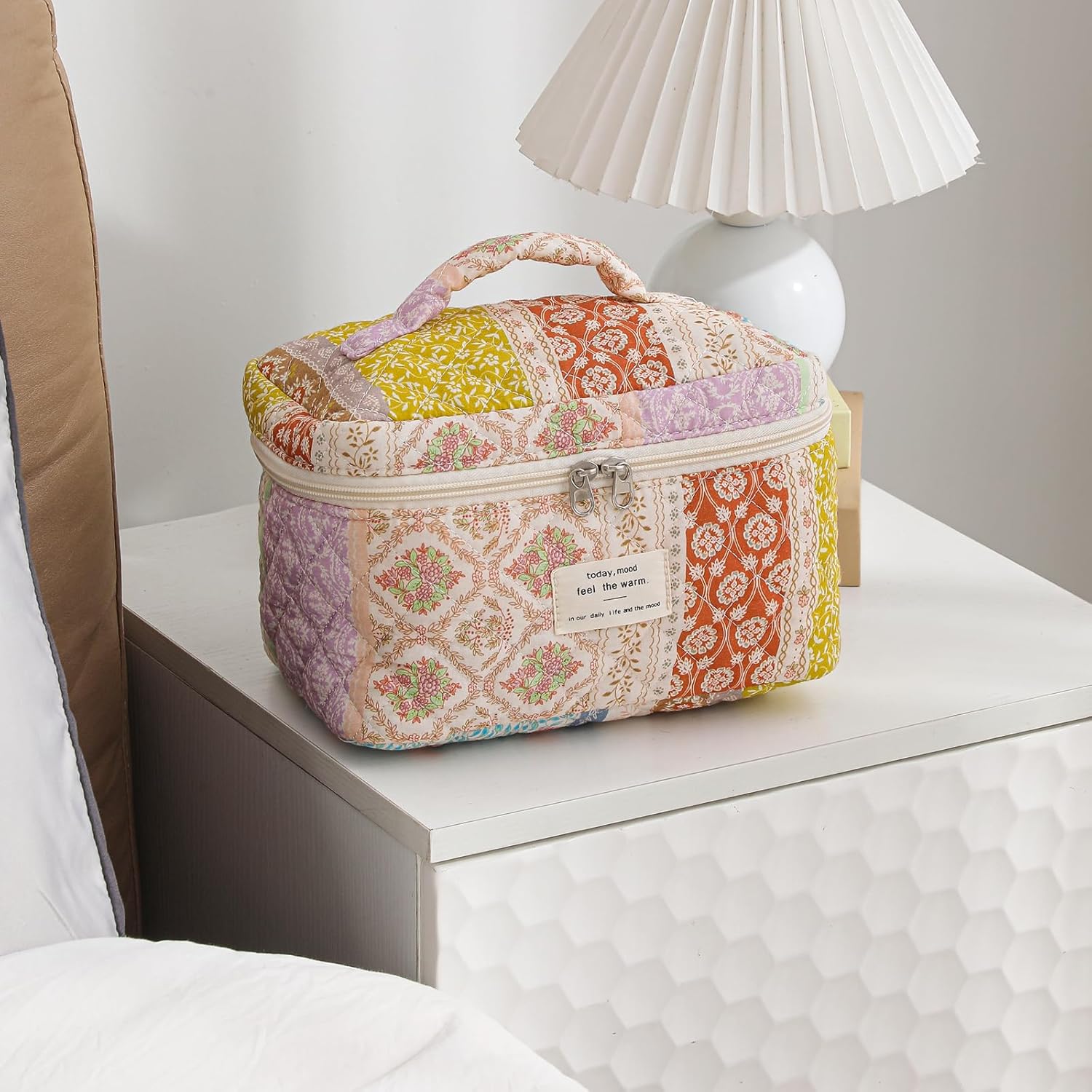 Our quilted cosmetic bag is made of high-quality cotton,it is soft and can be squished down, more durable and scratch-resistant.There’s no structure to the sides but it holds its shape with the contents you store inside. Floral print is super cute and clear.