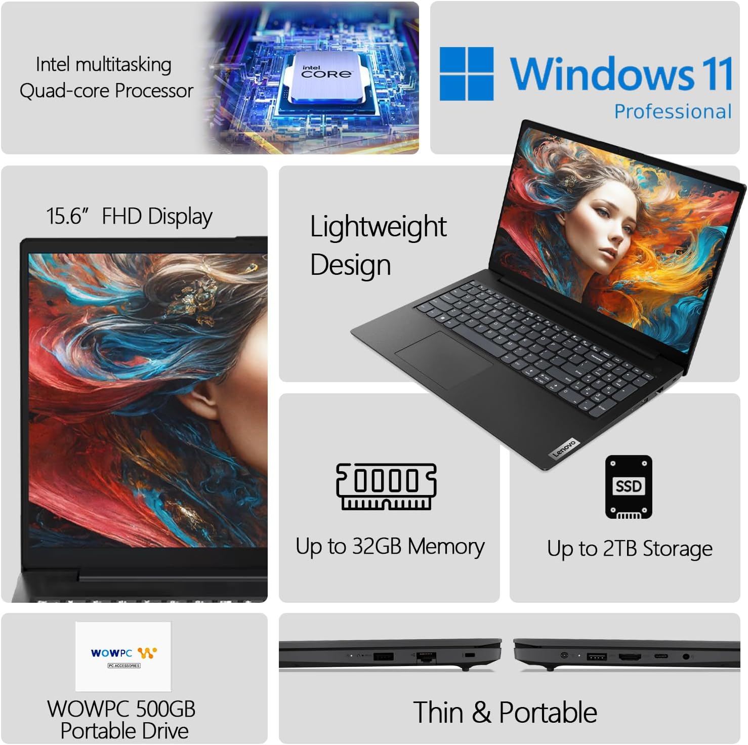 Lenovo Newest V15 FHD Laptop, Intel Quad-core Processor, 32GB RAM, 1TB SSD, 15.6″ FHD 1080p Display, Ethernet RJ-45, Ideal for on-The-go Multitasking, Windows 11 Pro, WOWPC 500GB Portable Storage