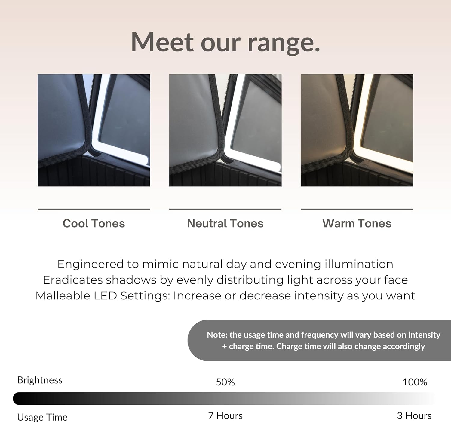 travel makeup bag with led mirror with customizable intensity for 3 settings: cool, neutral & warmtravel makeup bag with led mirror with customizable intensity for 3 settings: cool, neutral & warm