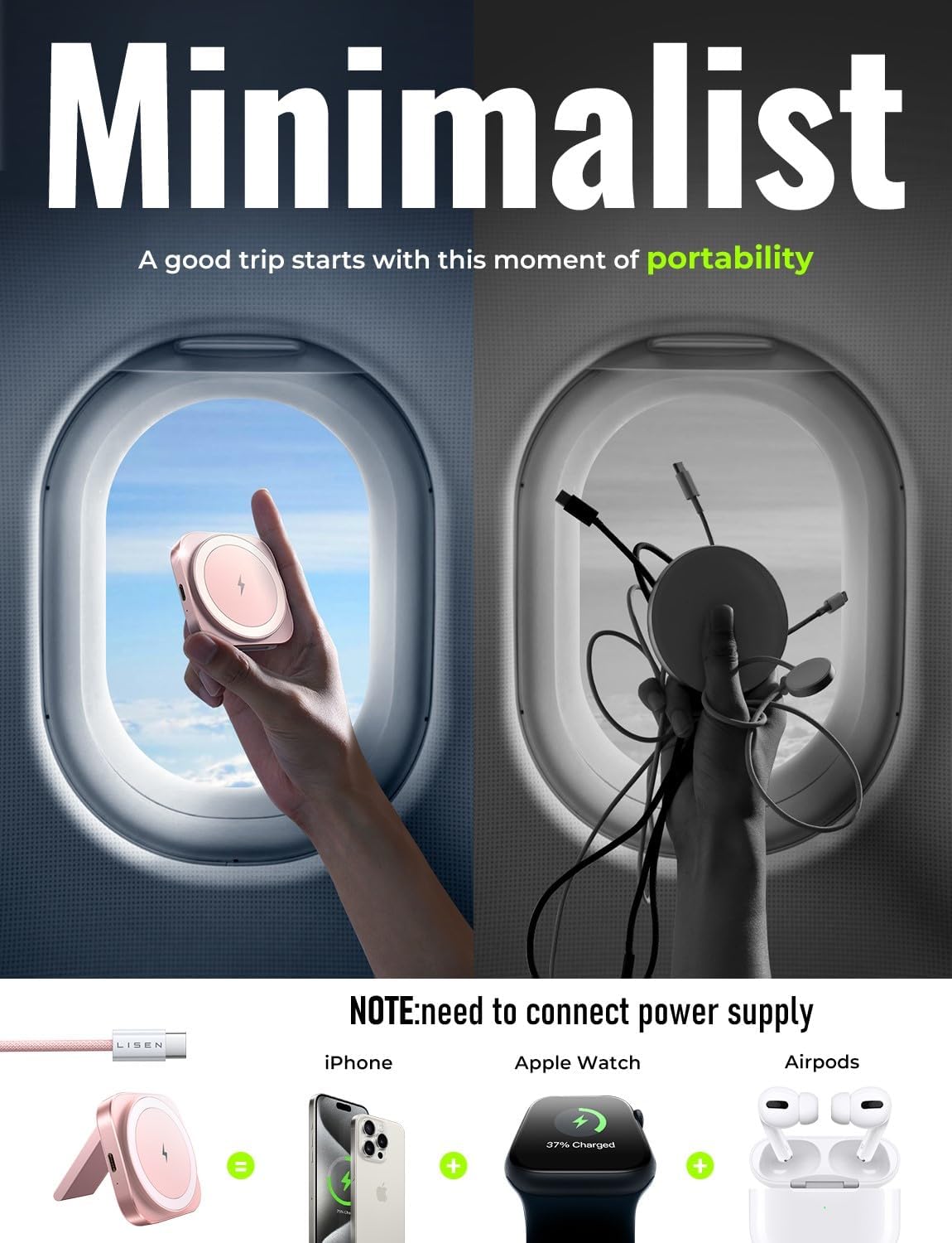 Friendly Reminder: This product is a 3-in-1 charger for iPhone, watches,and AirPods, not a portable power bank. The so-called wireless charger refers to an inductive charging connection with the iPhone, It’s not that cables and power supply are not needed.Its convenience lies in one charging head and one wire replacing the conventional three sets of chargers. Essential for travel.And the phone can be easily charged by placing it on, so that you won’t forget to charge it during idle time