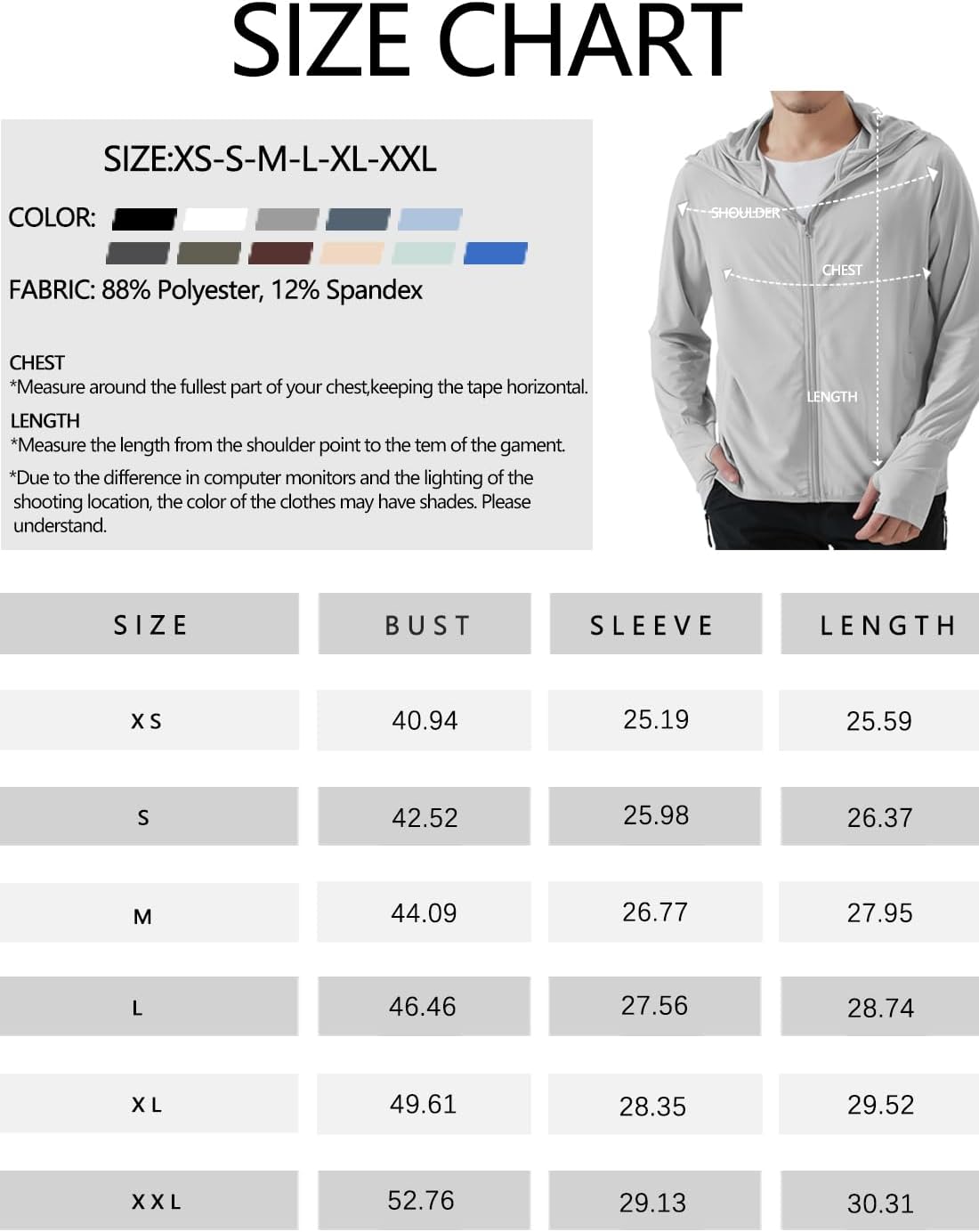 Full zip up sun shirts with hood, long sleeve with thumb holes, 4 useful pockets.