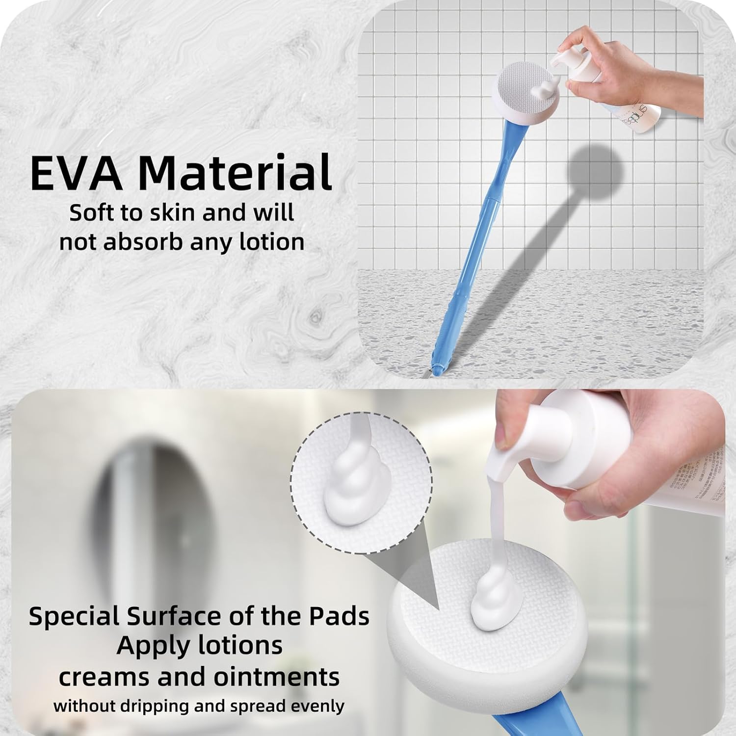 【Replaceable EVA Sponge Applicator Pads】- Our lotion back applicator comes with two extra EVA sponge applicator pads so you can easily apply lotion, self-tanner, sunscreen, and more without worry. The pads of the lotion applicator are made of EVA sponge, which is soft against your skin so you don’t waste your lotion, and has just enough texture to keep everything in place during use