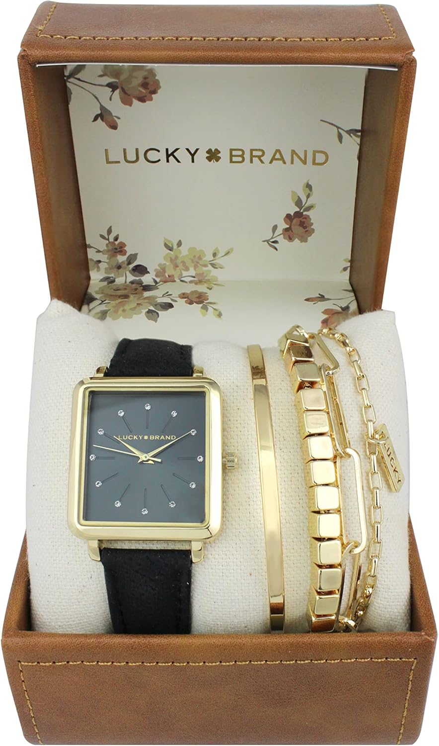 Lucky Brand Watches for Women Analog Display Diamond Dial with Leather Strap Watch Quartz Movement Bracelet Gift for her Box Set (Black)