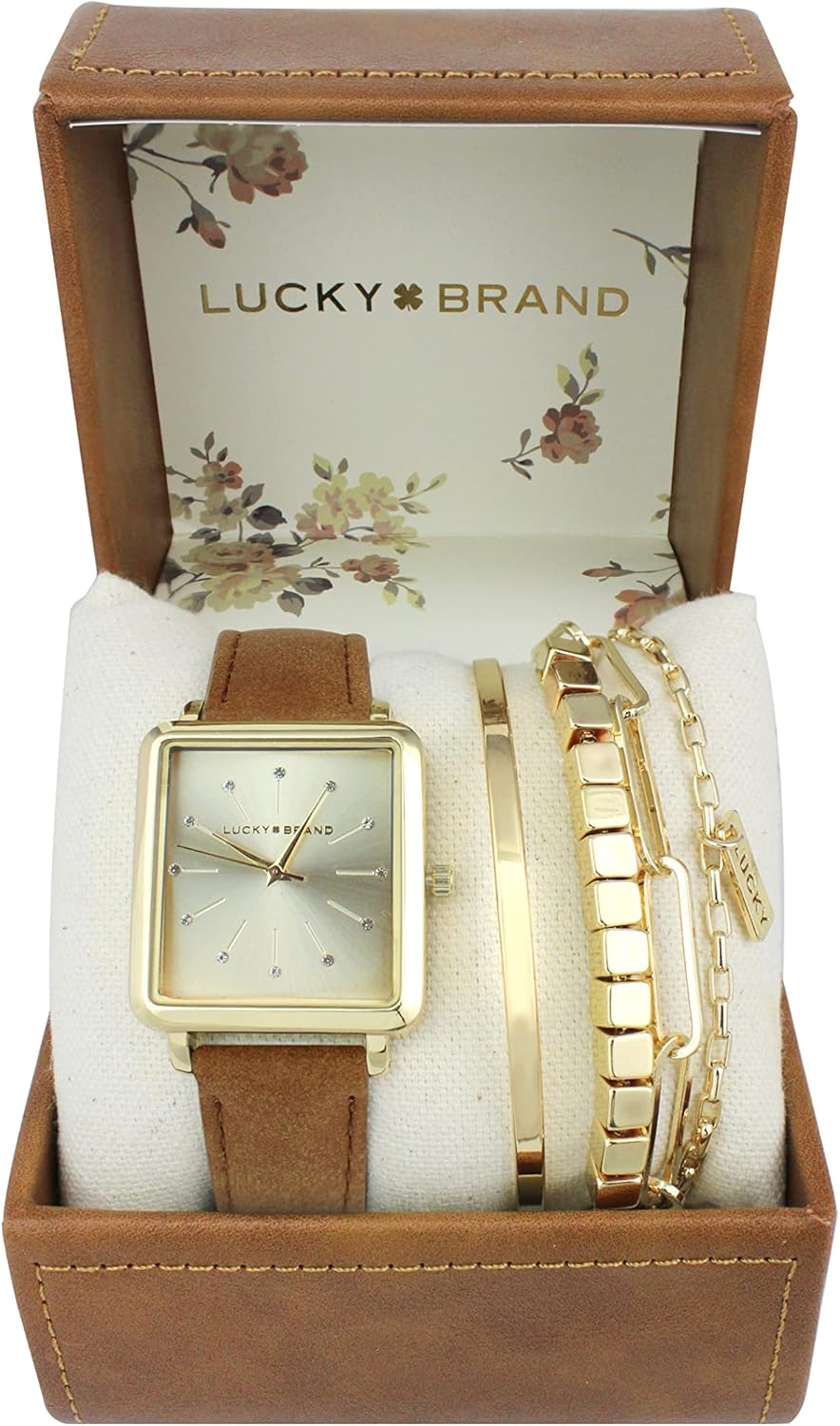 Lucky Brand Watches for Women Analog Display Diamond Dial with Leather Strap Watch Quartz Movement Bracelet Gift for her Box Set (Brown)
