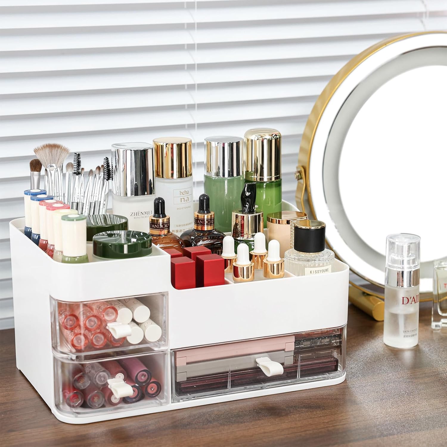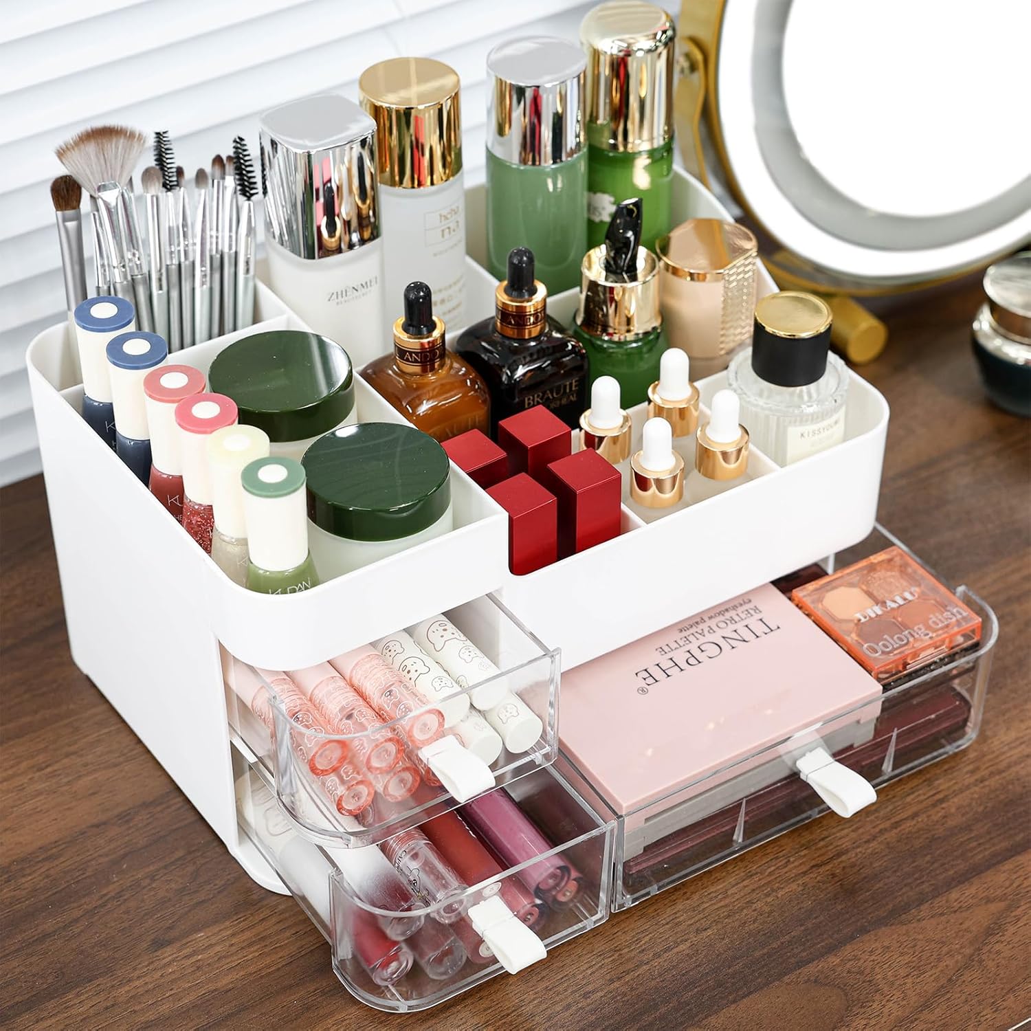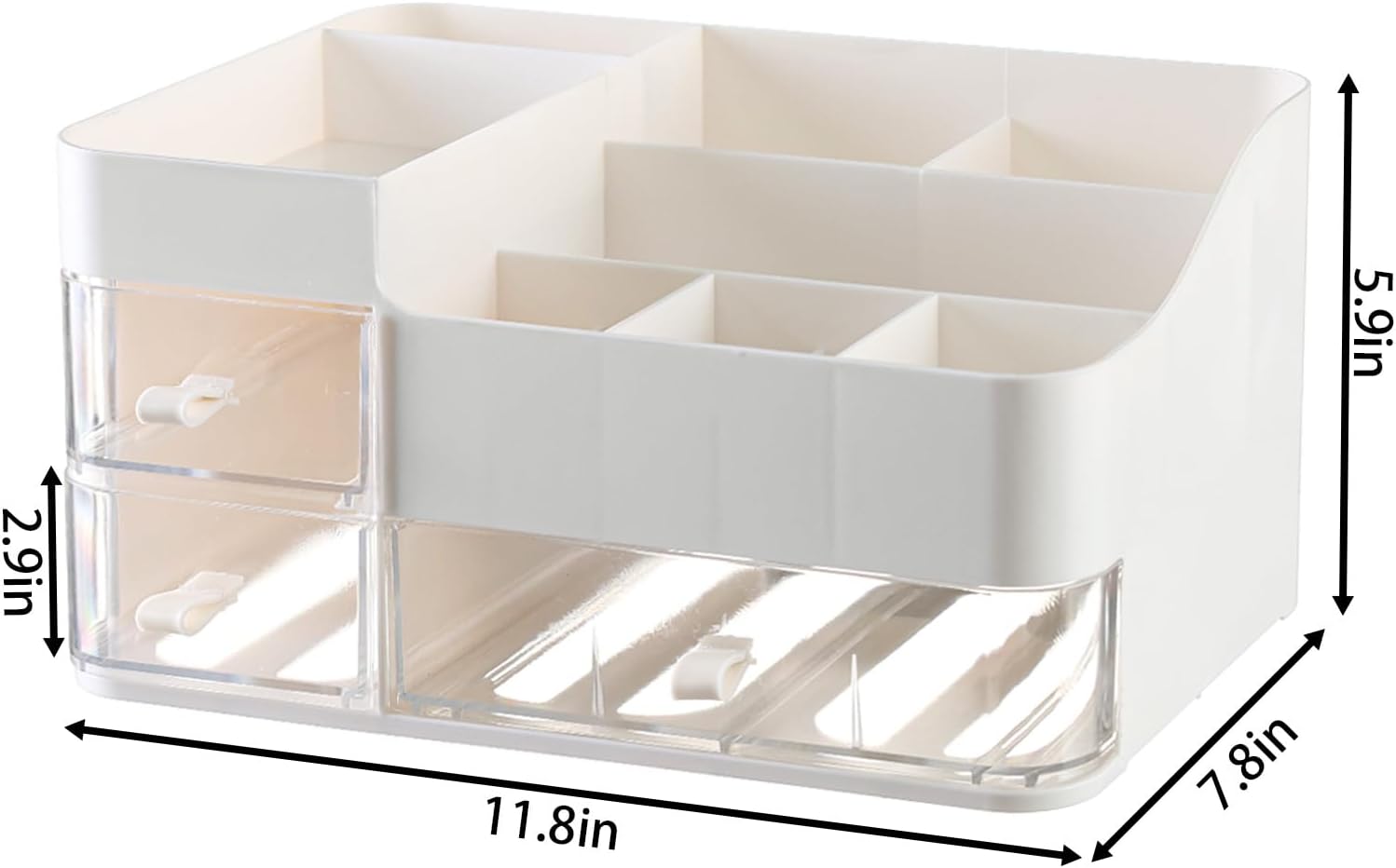 Our makeup storage has 1 large drawer and 2 small drawers for your facial mask or vanity kit&small item. 8 top compartments for holding moisturizer,lotions,lipsticks,nail polishes,makeup brushes,eyeliners,eye shadow palettes and other small everyday collection that all can be well organized and Let you quickly find what you need.