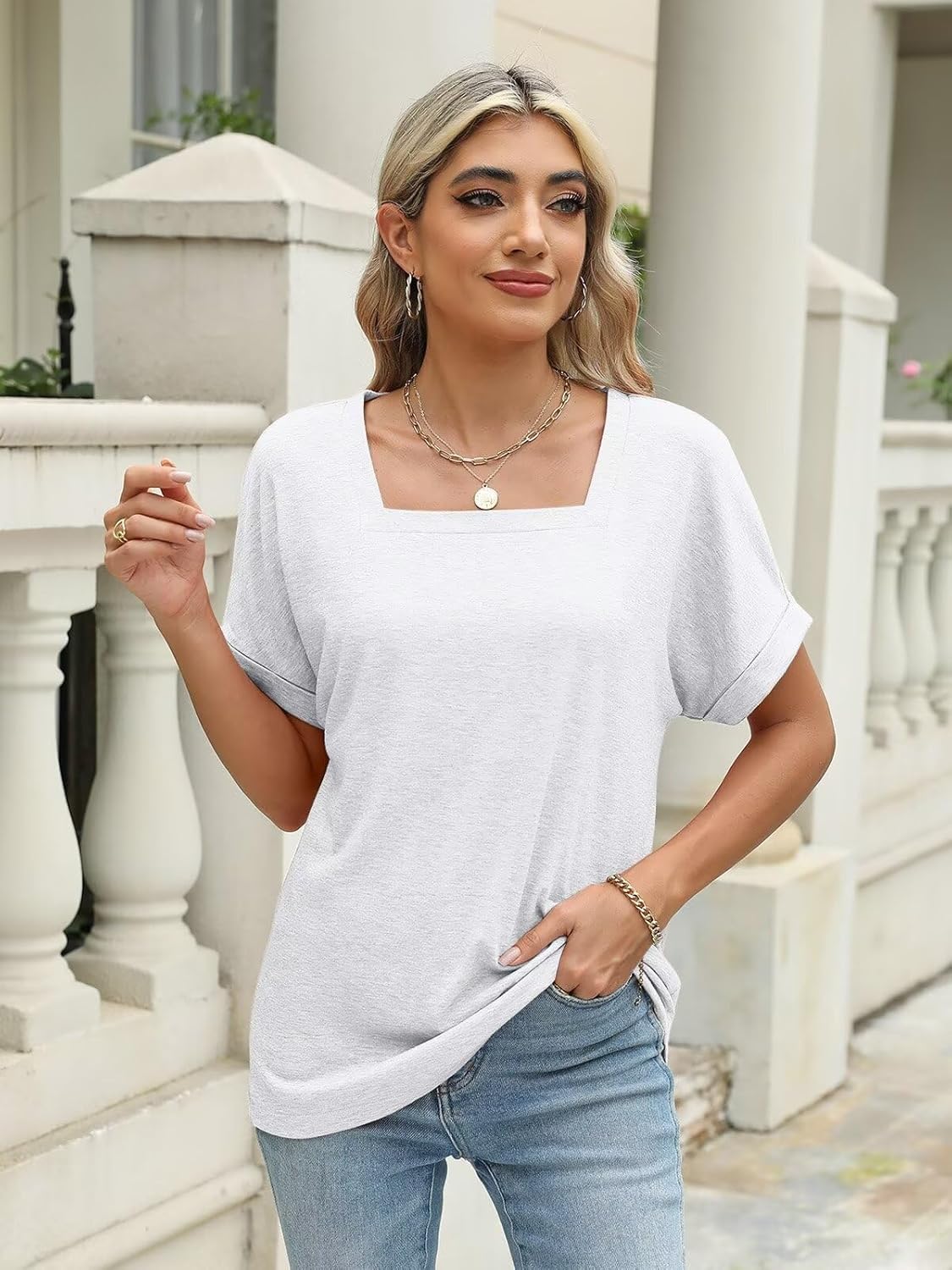 >Features: Square Neck Tops, Rolled Sleeve T Shirt, Short Sleeve Shirts, Womens Summer Tops, Solid Color, Casual, Cute and Classic; Womens square neck tops allow for many looks.