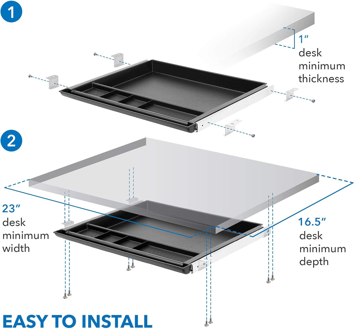 DURABLE AND STEADY: Built with metal sliding frame and durable hardened plastic tray, this attachable desk drawer is dependable, strong, and built to last all day long.