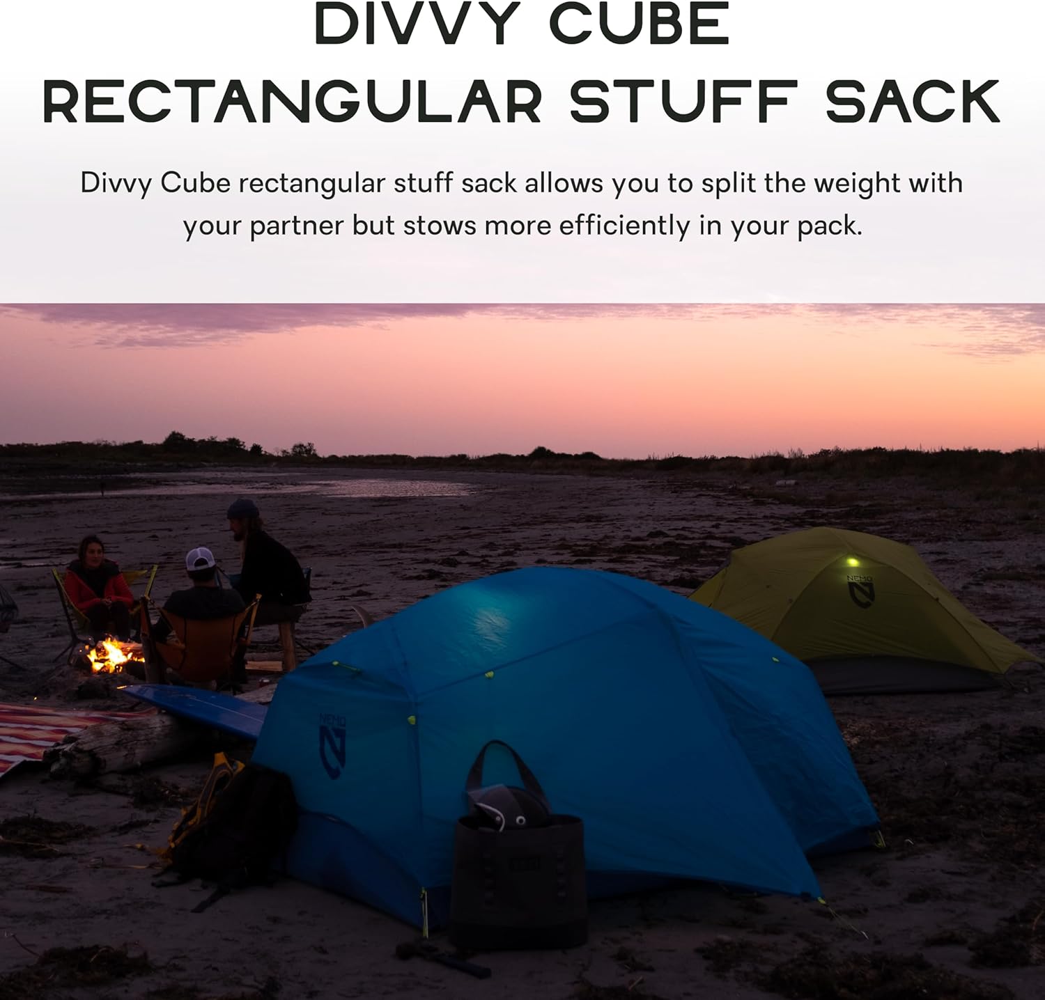 Divvy Cube rectangular stuff sack allows you to split the weight with your partner but stows more efficiently in your pack.