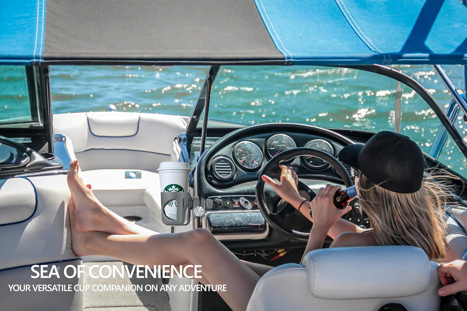 360° Stroll-n-Sip: The Ultimate Cup Holder for boats and kayaks. A multifunctional cup holder compatible with boats, kayaks, pontoons, fishing boats. Fits most bars / rails with widths between 0.55 inches to 1.7 inches.