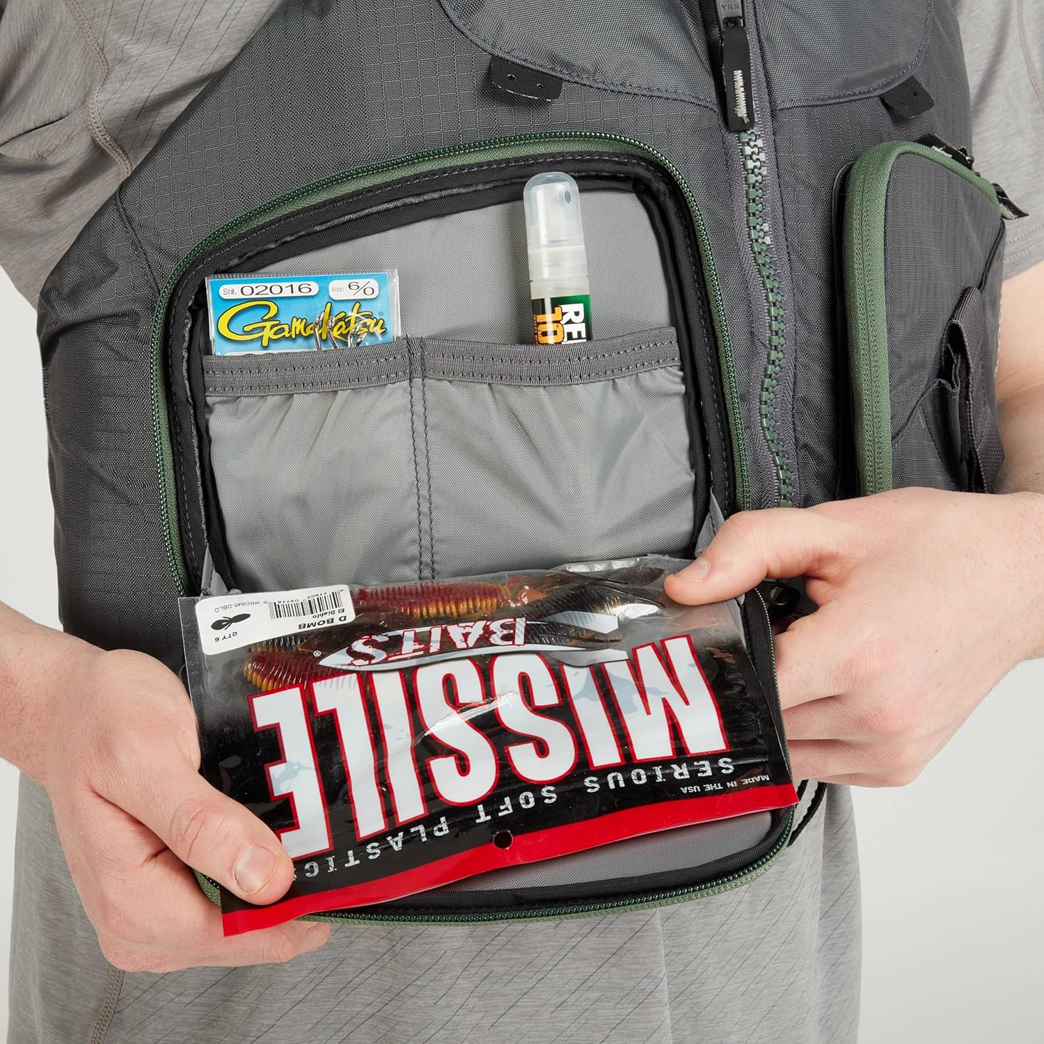 A single, exterior pocket on the angler’s right side offers easily accessible storage. A fifth, tool holder pocket offers quick access to pliers, line cutters or other fishing gadgets and secures with a hook-and-loop fastener.