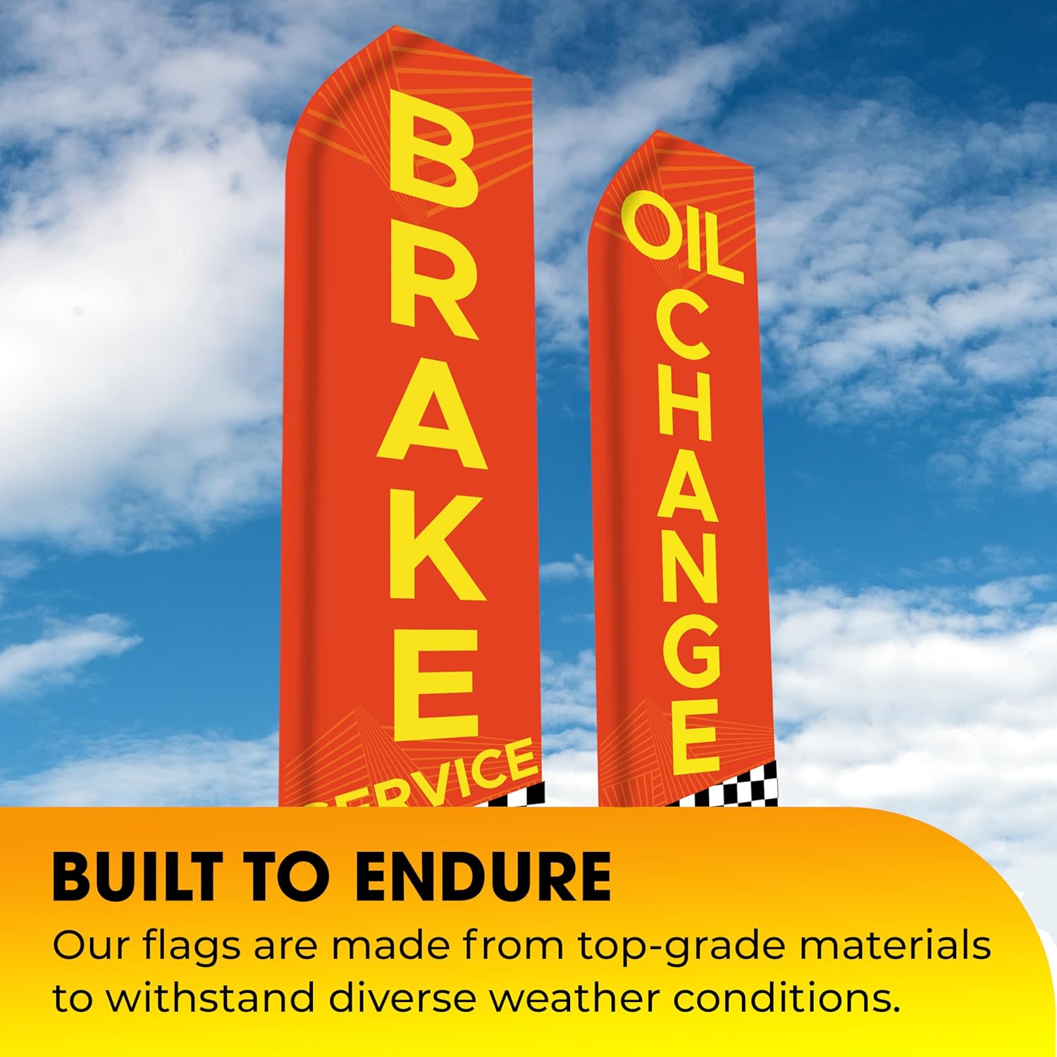 King Sized Flags: Get noticed with our package including 3 king-sized flags: automotive, oil change, and brake service. Enhance your shop’s visibility with flags and mechanic shop signs. (Pole and spike sold separately). Crafted from durable 100% polyester knit, these flags are designed to withstand outdoor elements and ensure longevity for your advertising needs. (Updated Design)