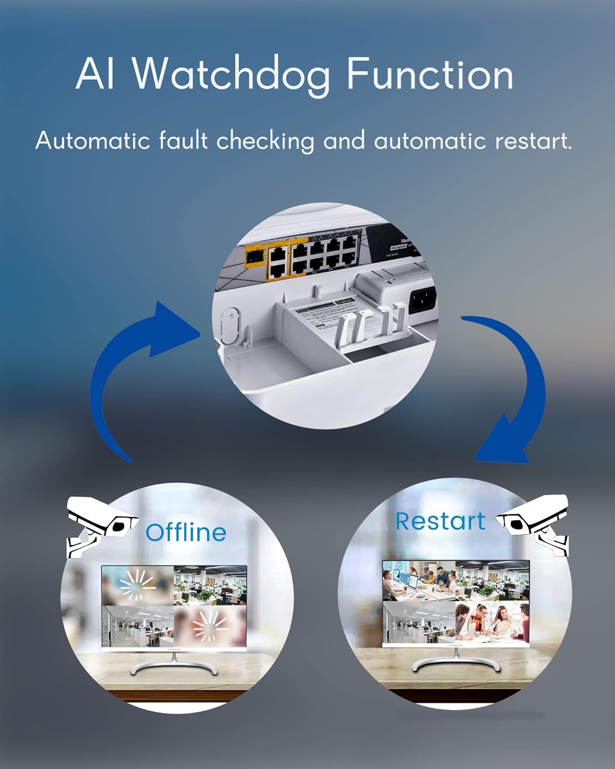 Watchdog AI Function: Automatic detection, automatic restart, detects the power receiving port automatically, once it registering lost packets poe port will power cycle to restore connection to device.