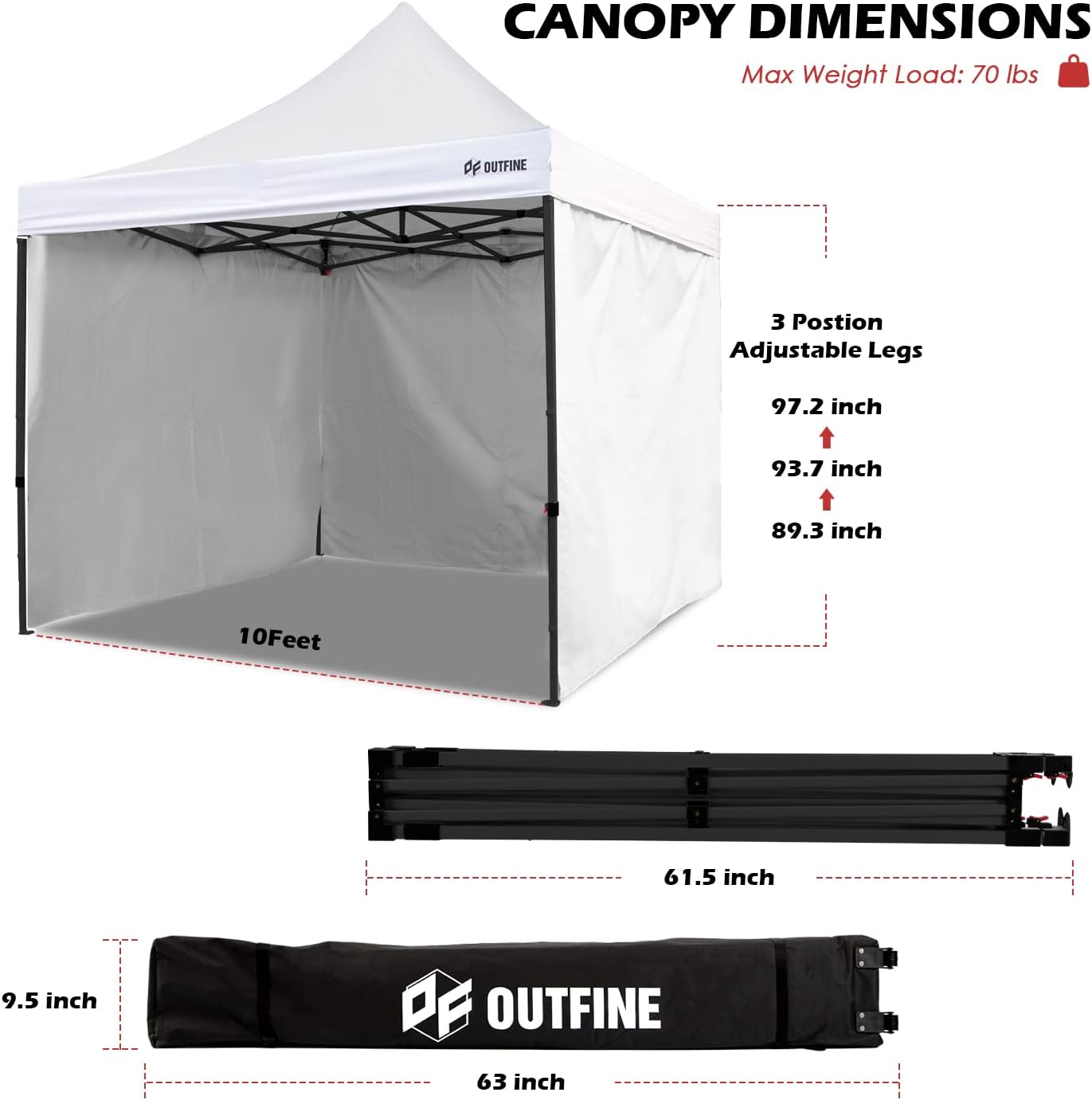 EASY TO ASSEMBLE – Only two people are required to easily complete the entire assembly in a few minutes. Take out the canopy frame and top tarpaulin from the bag, place it on ground and unfold it, place the tarpaulin over the frame, then pull it to each corner end fully and extend the legs and it is done. Three different height settings allow you to pick the height which you want, 89.3 inch, 93.7 inch and 97.2 inch. Thumb latch lock system easy to lock and release.