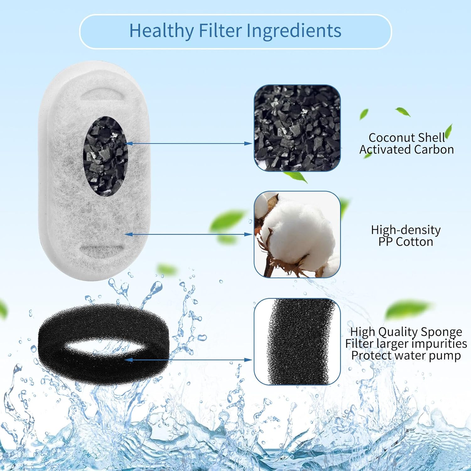 All Materials are Food Grade:The cat fountain filter replacement features a comprehensive 3-fold filtration system, consisting of activated carbon, ion exchange resin, and non-woven fabric.The cat fountain filters can filter hair, heavy metals, and improve the taste of the water so that pets can drink clean and fresh water all day.