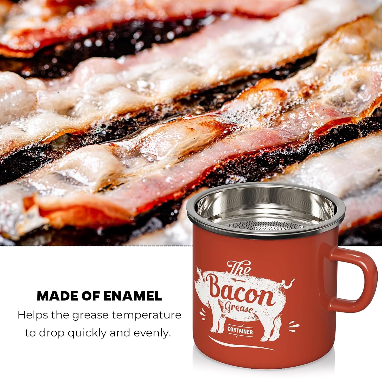 [Stylish Design] – The bacon grease keeper holds 15 OZ of grease, which is functional for both straining, storing, and transferring. The enamel container helps the grease temperature to drop quickly and evenly. The stylish cup wall pattern makes up its retro farmhouse style.