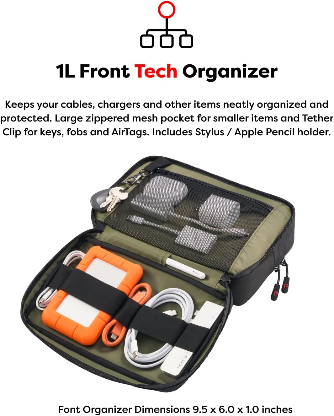 1L FRONT TECH ORGANIZER: Keeps your cables, chargers and other items neatly organized and protected. Large zippered mesh pocket for smaller items and Tether Clip for keys, fobs and AirTags. Includes Stylus / Apple Pencil holder. Interior dimensions of 1L side = 9.5 x 6.0 x 1.0 inches.