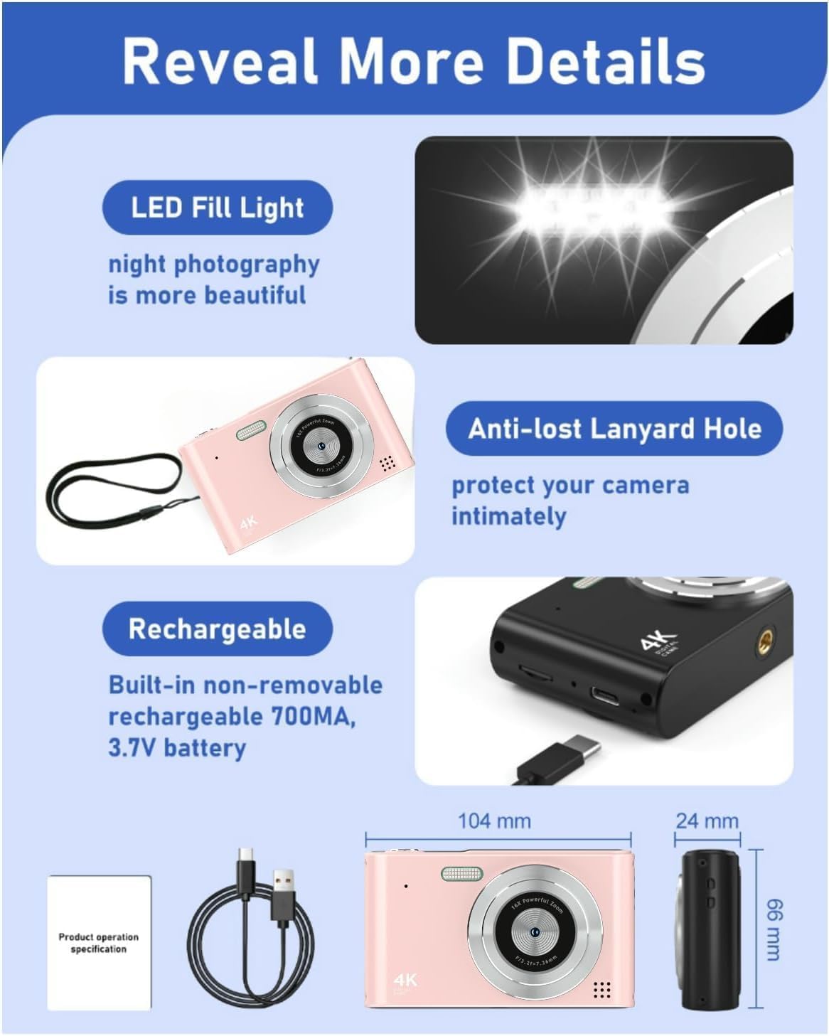 📸[EASY TO USE AND QUALITY SERVICE]-The 4k pink travel camera comes with a 32G TF card, which can satisfy your needs for long time high capacity shooting. We provide point and shoot digital cameras free lifetime warranty. If you encounter any problems when using your digital camera, please feel free to contact contact us, we will reply you within 24 hours.