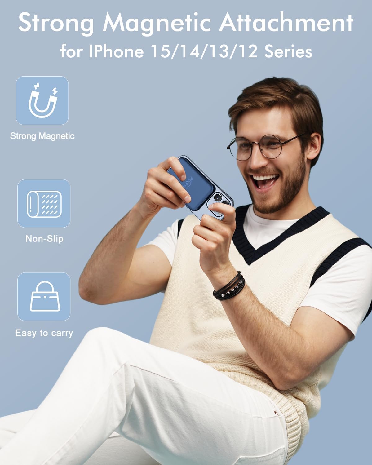 Great Compatibility & Strong Magnetic: Mag-Safe battery pack with the newest magnetic technology (stronger magnetic and nano adsorption), can directly hold the back of your iPhone 15/14/13/12 Series: iPhone15, iPhone15 plus, iPhone15 Pro/Pro max, iPhone 14, iPhone 14 Plus, iPhone 14 Pro/Pro Max, iPhone 13, iPhone 13 mini, iPhone 13 Pro/Pro Max, iPhone 12, iPhone 12 mini, iPhone 12 Pro/Pro Max(Note: Need to be aligned with the magnetic suction, without cases or with Mag-Safe cases)