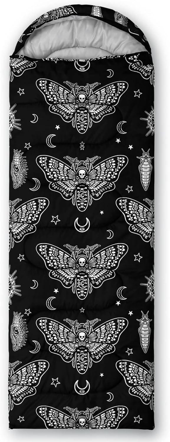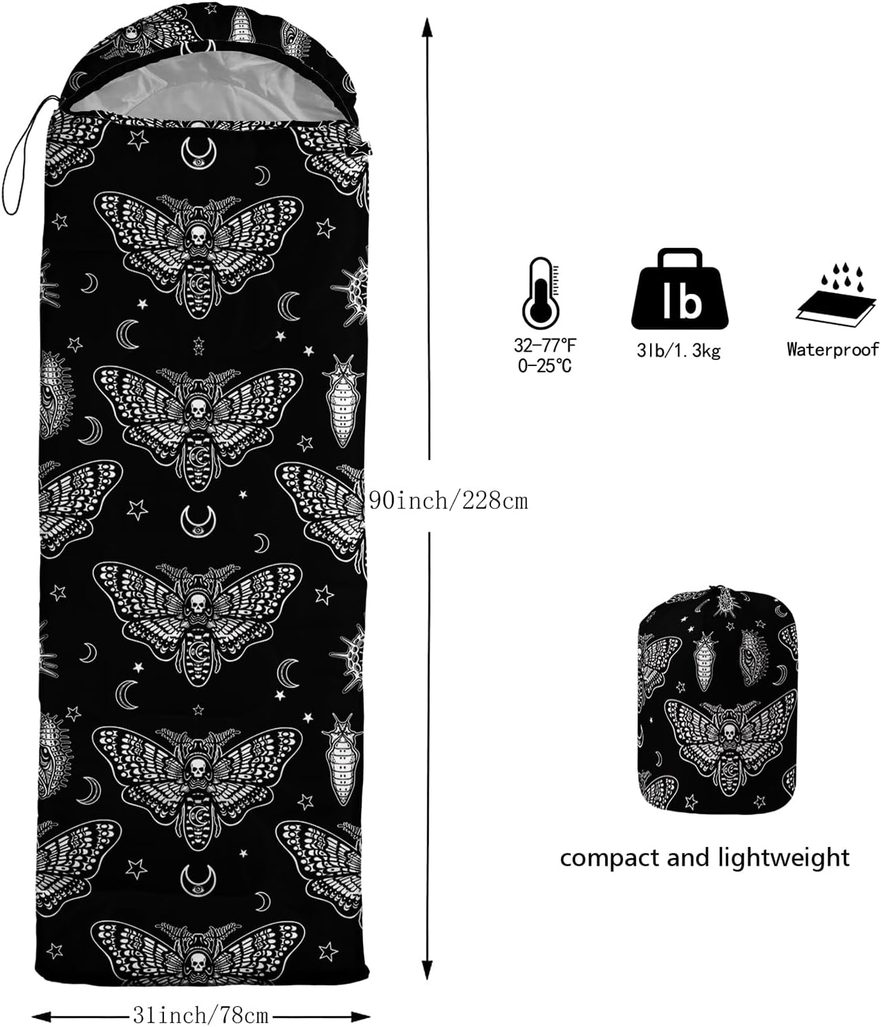 【Fits For 3 Seasons】: Size – 31 by 90 inches (W x D). Our Death Moth sleeping bag can be used in 3 seasons with a design temperature of 32℉-77℉(0℃-25℃). These Sleeping bags also have a weather resistant waterproof design to keep you warm and prevent you from any dampness.