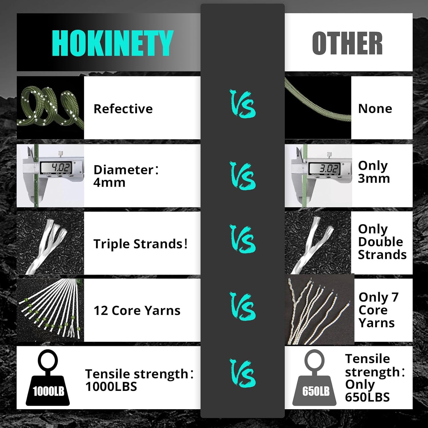 550 LBS UPGRADE TO 1000 LBS: Featuring an abrasion-resistant 32-wire sheath and a 12-strand inner core. Our parachute rope is rigorously tested and rated with a minimum breaking force of 1000 pounds, providing an additional 250 pounds of resistance compared to the standard 750-pound parachute rope. Thickness of 4 mm. Explore our HOKINETY reflective parachute kit now