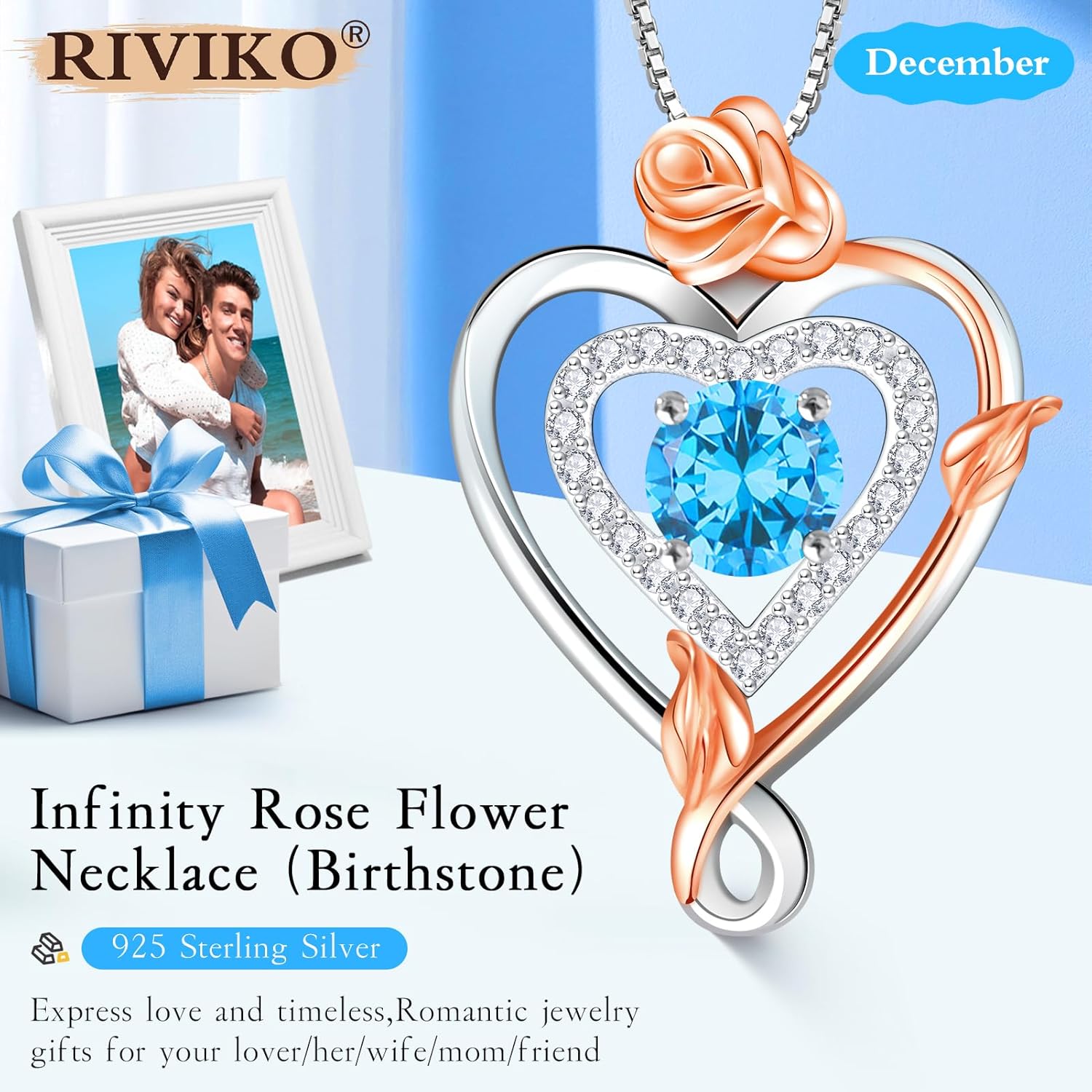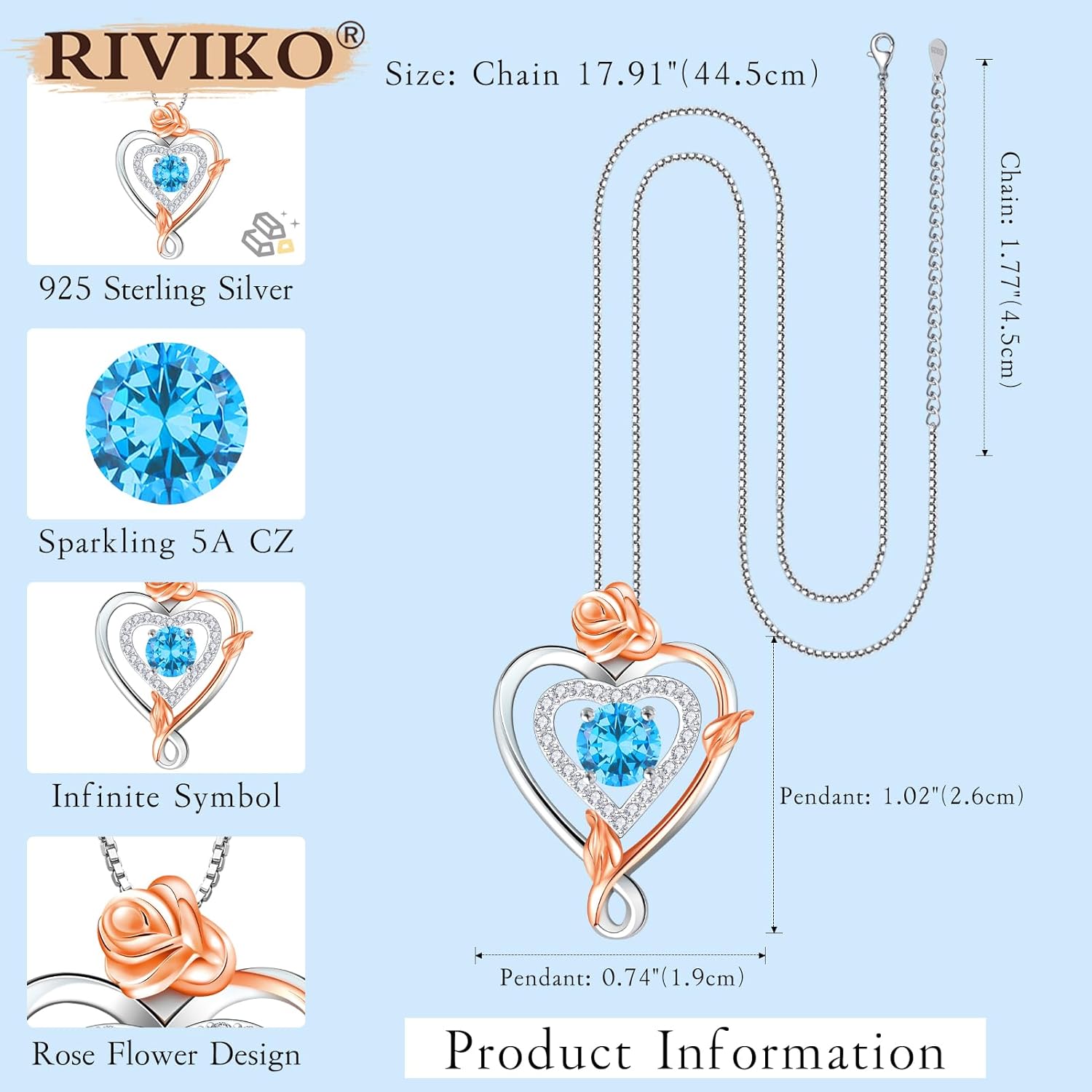 RIVIKO Infinity Heart Symbol Rose Birthstone Necklace for Women,925 Sterling Silver Heart Pendant Necklaces,Anniversary Jewelry Birthday Mothers Day Gifts for Mom Wife Women Girlfriend Her