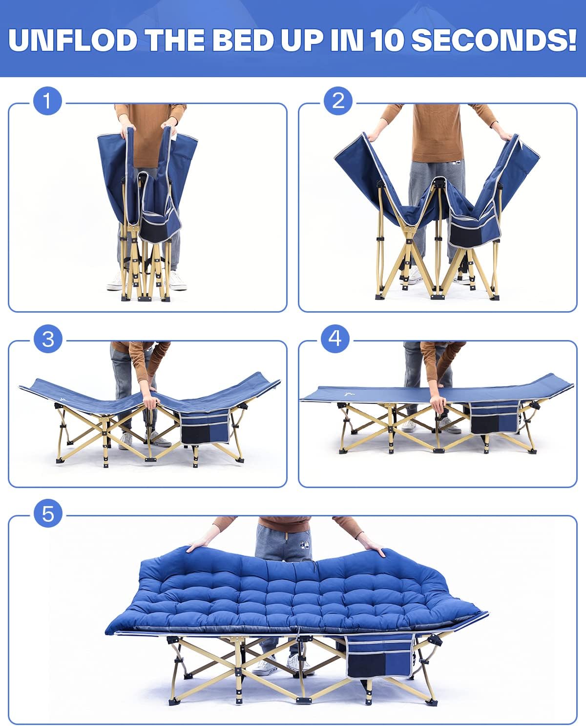 Double sided Pocket Design: The two lagre pockets of camping cots for adults keep all your things handy right next to you! The ultra convenient side pockets store sunglasses, books, phones, headphones, water bottles and so much more!