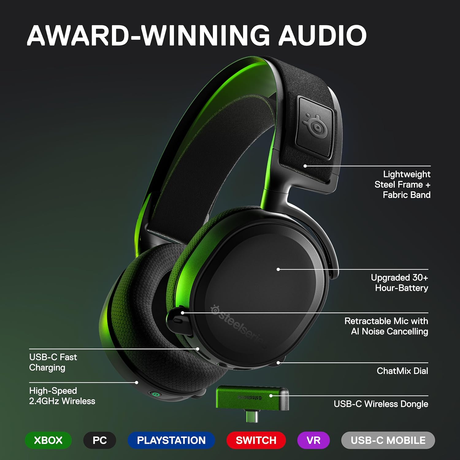 The SteelSeries Arctis 7X+ Wireless headset is designed specifically for Xbox Series X|S with compatibility for Xbox One, PC, PlayStation, Mac, Android, Oculus Quest 2, and Switch. Featuring USB-C charging, improved 30-hour battery, ClearCast mic, on-ear headset controls like ChatMix, a durable lightweight steel frame, and ultra-low latency 2.4GHz wireless.