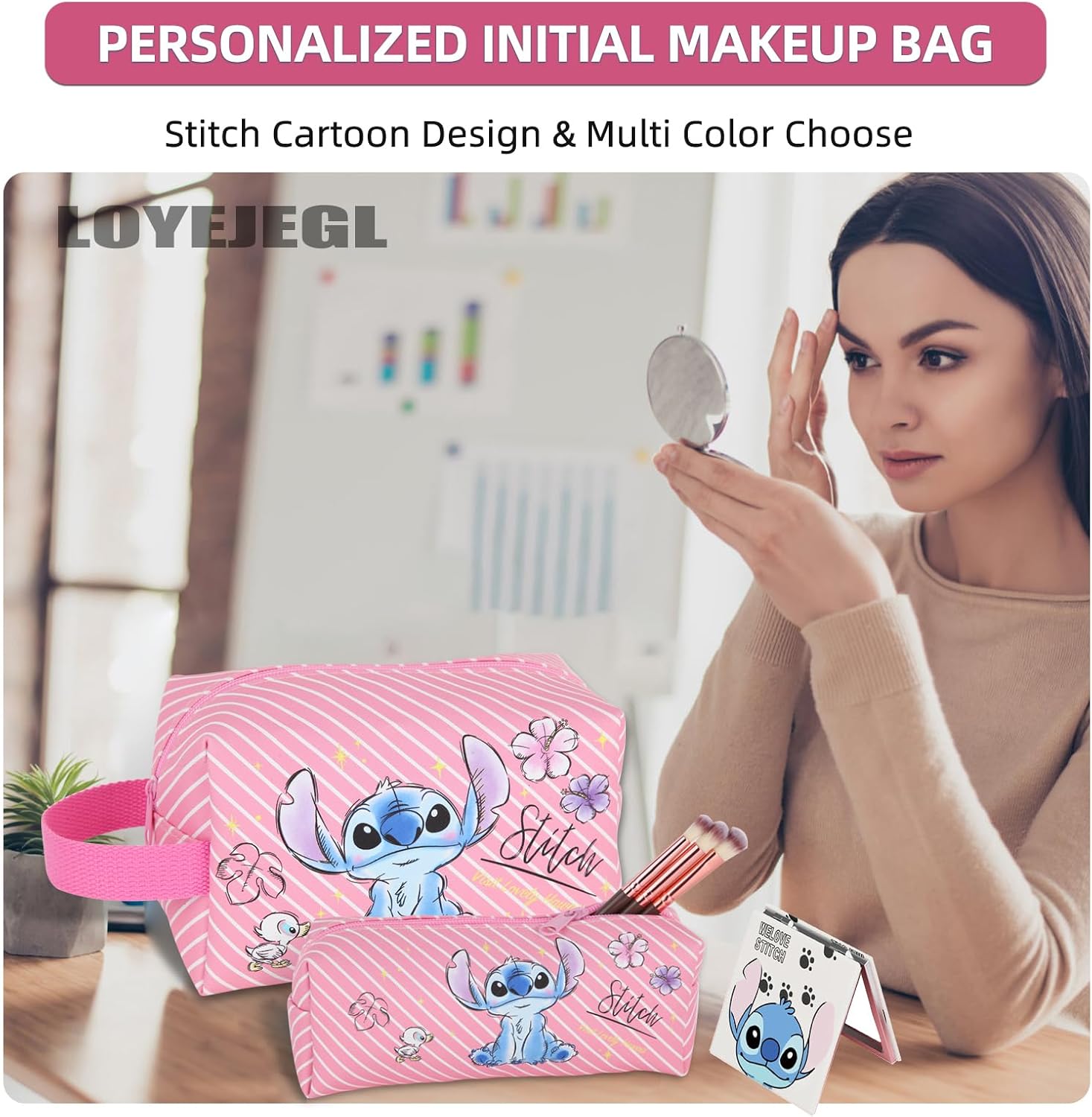 FASHION DESIGN: side handles make the travel bag for toiletries and cosmetics easy to carry, organizer bag, makeup mirror, All in Stitch style, cute and beautiful.