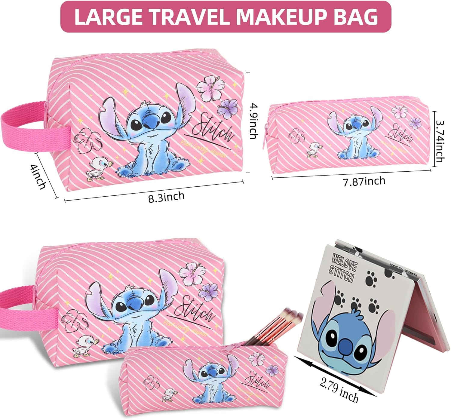 Stitch Stuff Travel Cosmetic Bag + Double Sided Cosmetic Mirror + a makeup brush bag, Large Capacity PU Travel Toilet Bag Makeup Accessories Organizer, Best Gift for Girls and Women (Pink)