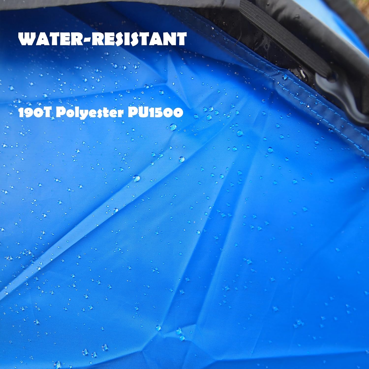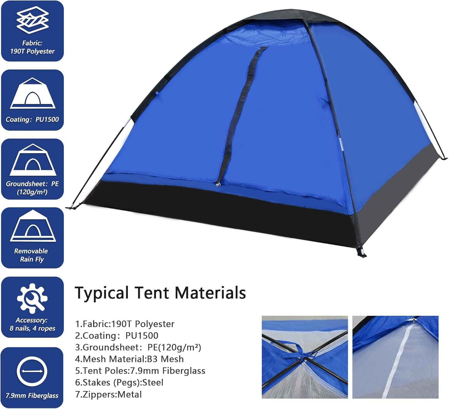 🌬Waterproof Tent & Durable:The camping dome tent is featuring 190T polyester PU1500 and Groundsheet Polyethylene(PE) that is both ripstop and highly resistant to water and wind. this tent is equipped with waterproof tape on every seam.The tent for camping boasts a robust construction featuring two durable fiberglass poles with a 7.9mm diameter each. 8 Metal ground stakes and 4 windproof ropes are included to enhance stability and durability.