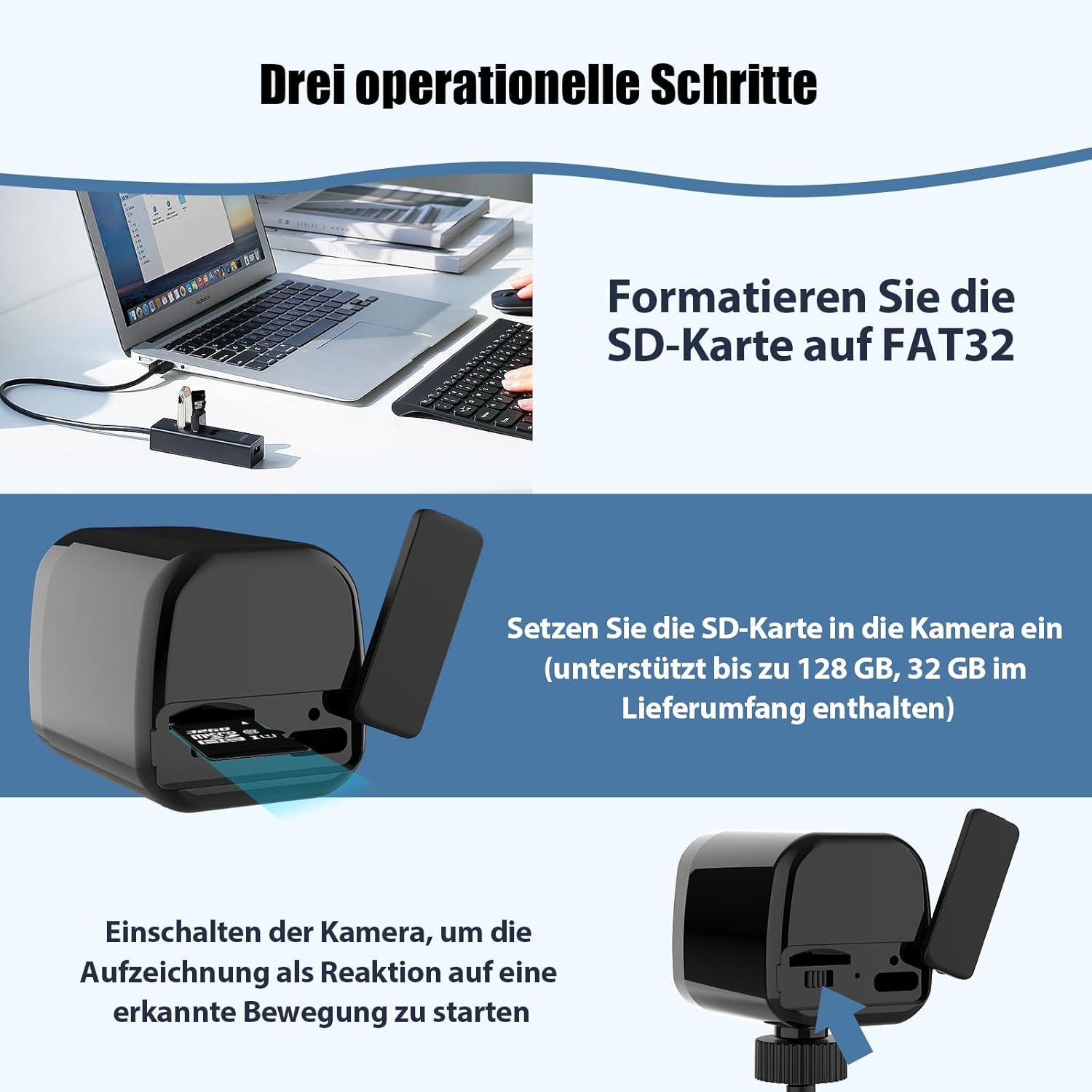 Seamless Security Experience with Our Tiny Camera:Experience seamless security with this 1080P mini security camera, designed for hassle-free use with its cordless design. Say goodbye to tangled wires and complicated WiFi setups. Simply insert a micro SD card (8-128GB, 32GB SD card included), power on the camera, and start enjoying crystal-clear 1080p UHD resolution with smooth video recording at 25-30 frames per second.