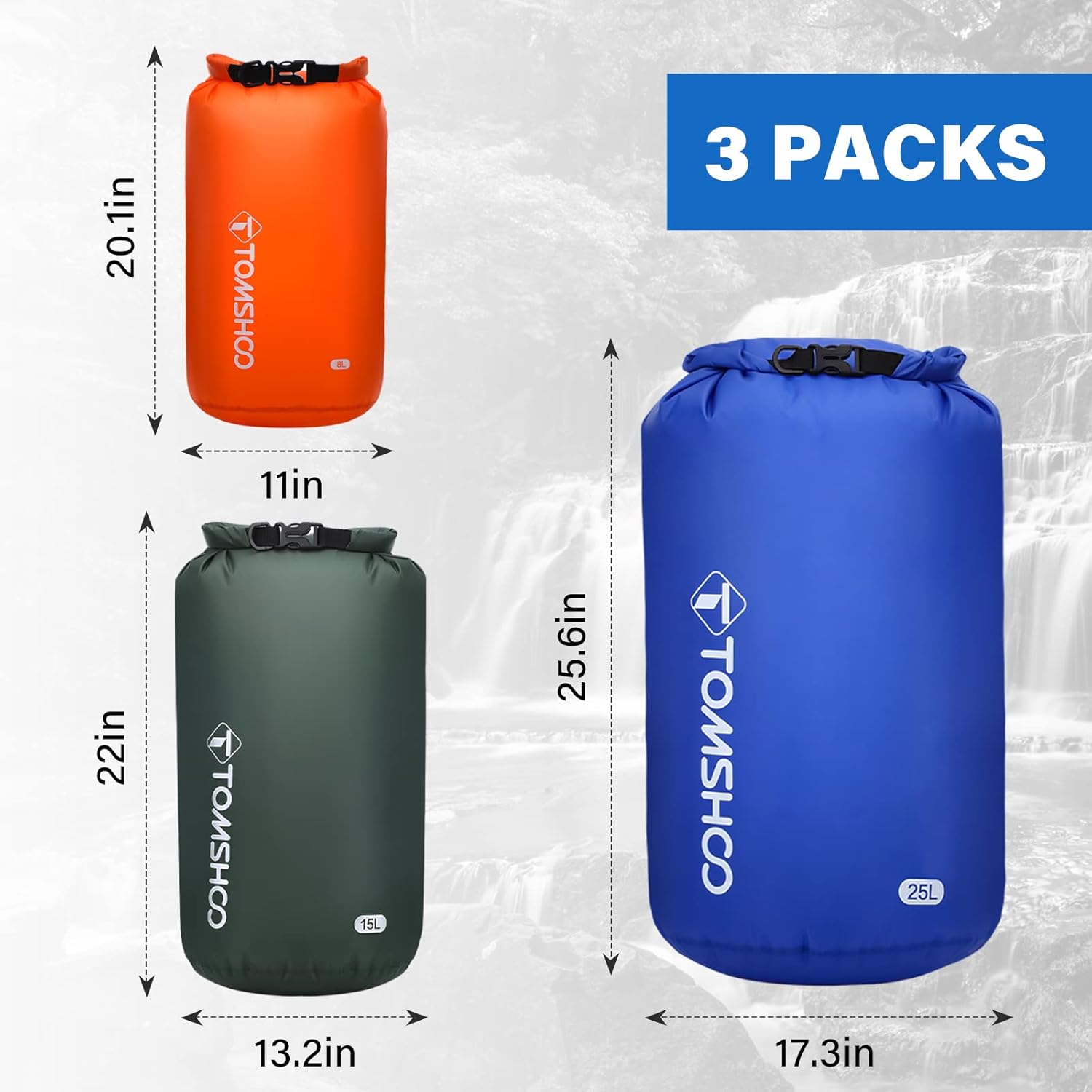 Waterproof Bag Set: the dry bag includes 3 sacks (3L+5L+8L) / (8L+15L+25L), 5 sacks (5L+12L+15L+25L+35L, so you can classify items waterproof, easy to use and find.