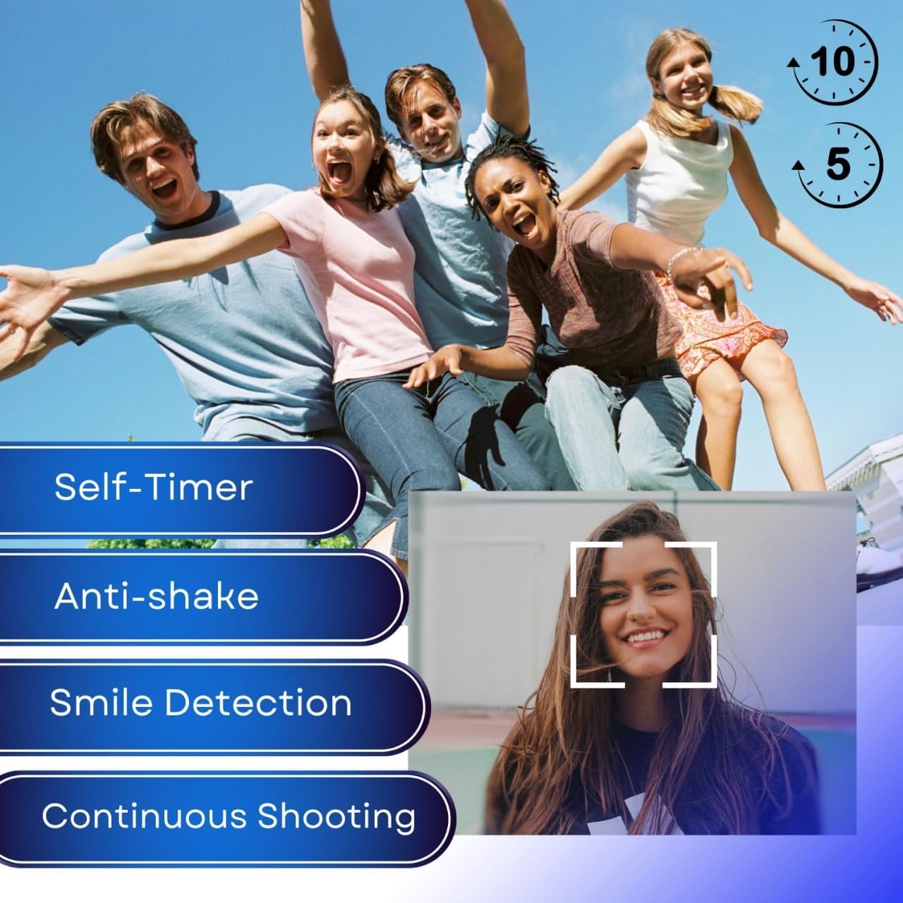 Anti-Shake & Multiple functions- When you use this digital camera to take pictures, Anti-Shake can make the picture stable and clear, Fill light can let you take high quality photos in low light conditions, and a variety of image styles, Self-timer,, Face Detection , Smile Detection, Continuous Shooting, and other features waiting for you to unlock .