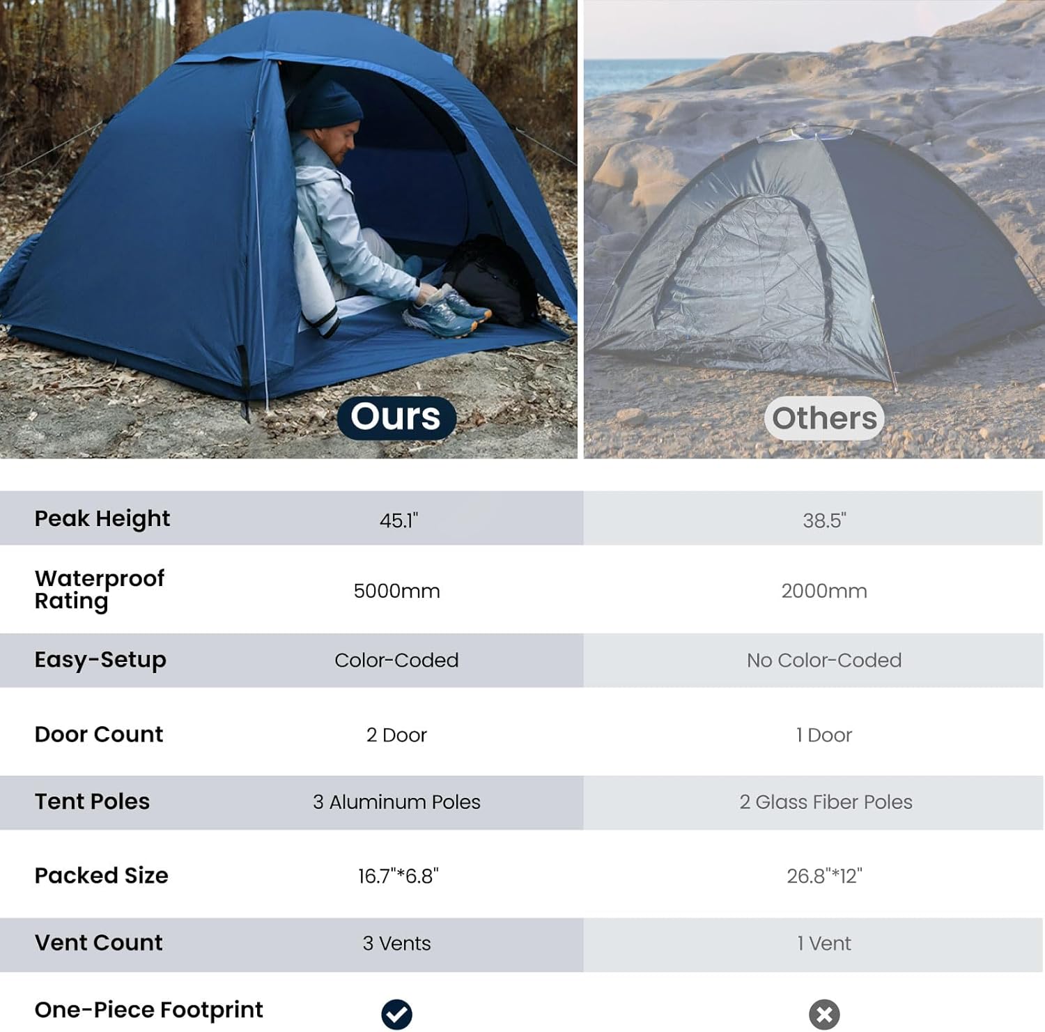 Unmatched Waterproof Capability: The 2-person tent’s rainfly is treated with a special PU5000 coating, repelling rainwater like a lotus leaf. Welded floors, inverted seams, and waterproof tape enhance protection against leaks. Stay dry and worry-free inside this waterproof tent, no matter the weather conditions.
