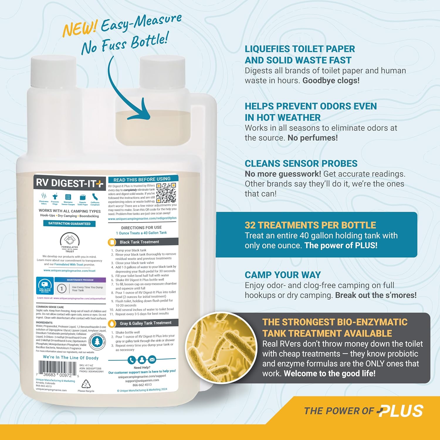 The Power of Plus. Our strongest complete RV tank treatment in a no-fuss bottle. The easy-measure 32 ultra concentrated treatments are significantly stronger than RV Digest-It Classic. Breaks down clog-causing waste and eliminates porta potty smells and sewer stink in your tank.