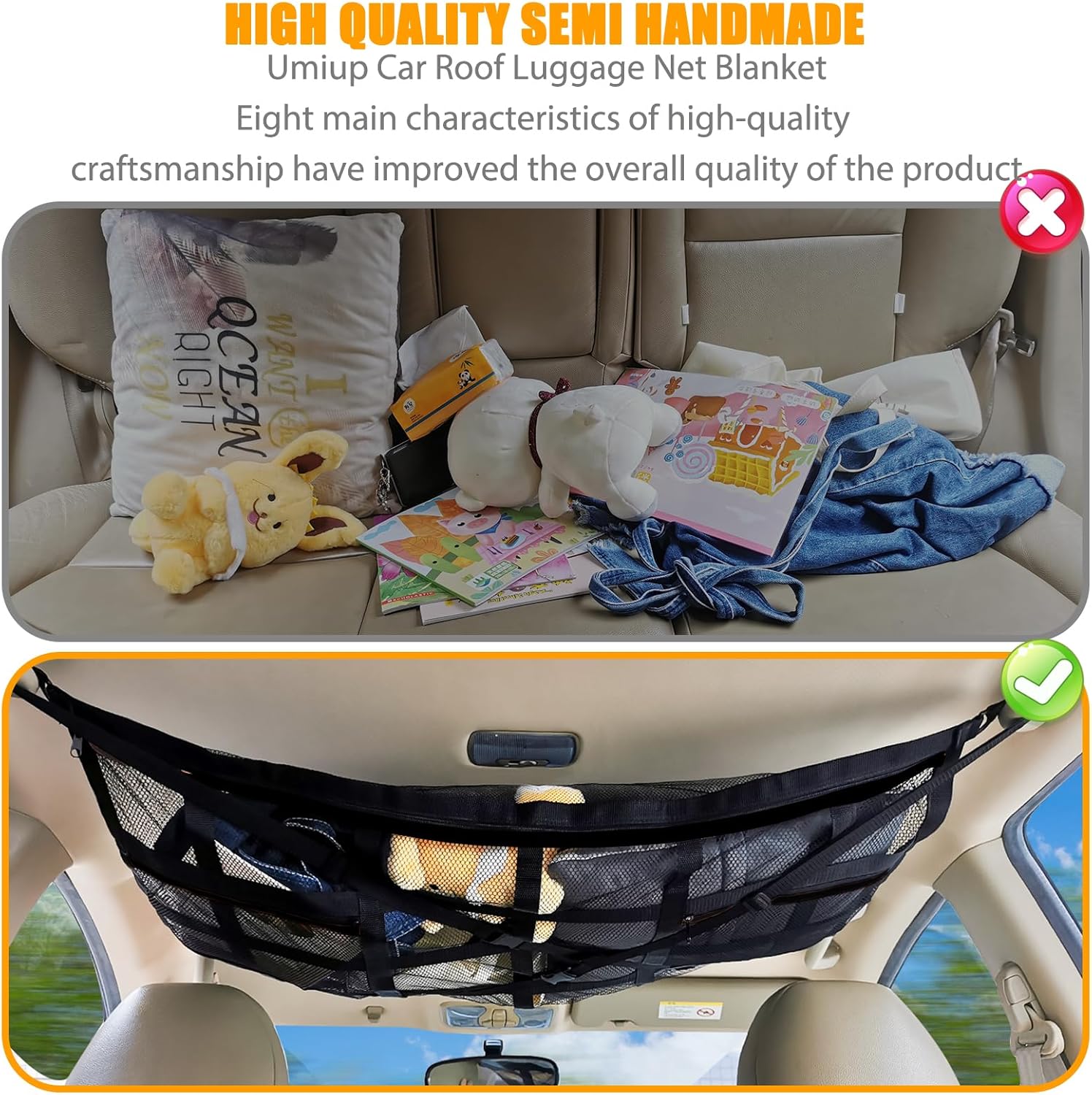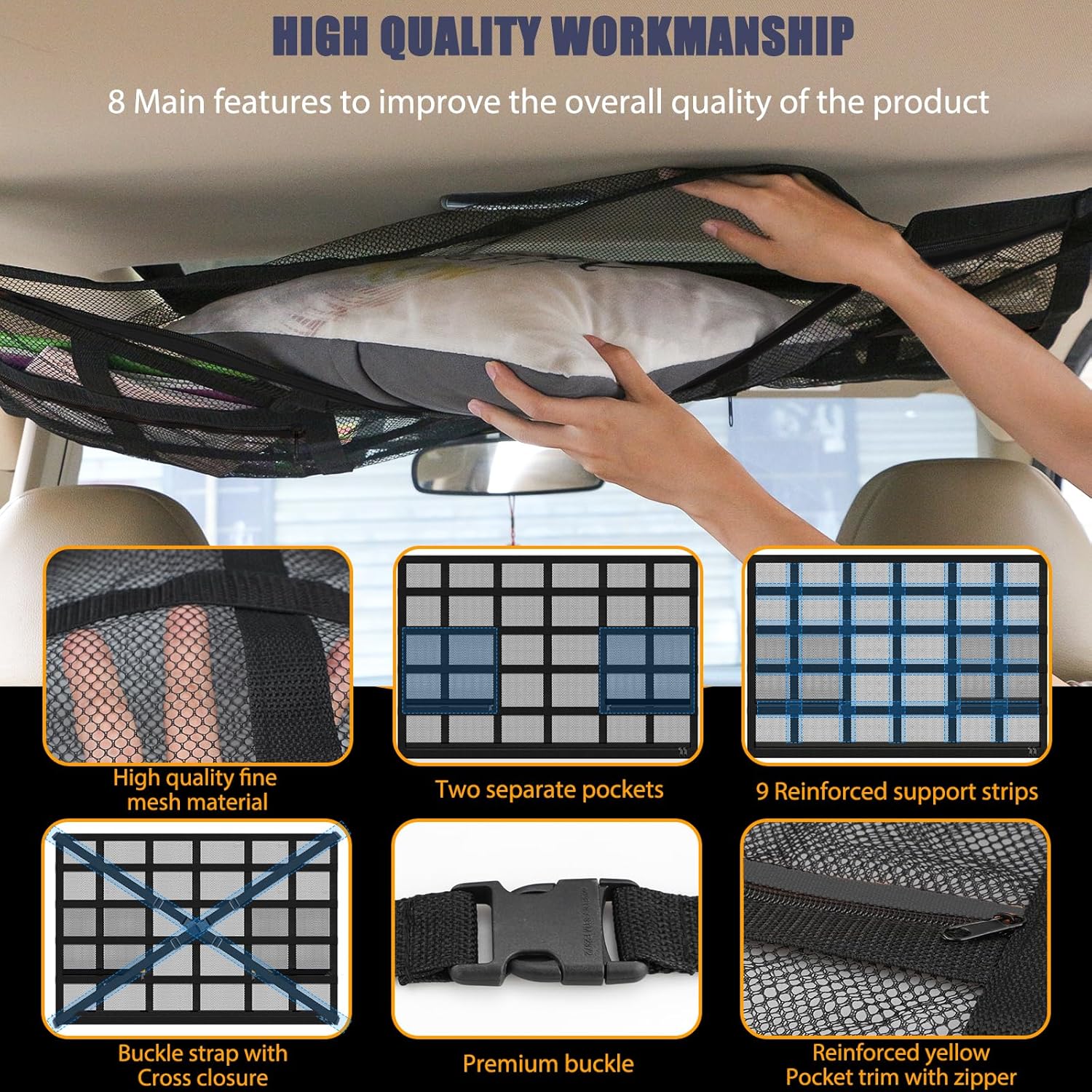 SPACE SAVING, LARGE CAPACITY:The upgraded SUV car storage mesh bag has two fastening buckles. Lightweight items such as baby blankets, children’s toys, handkerchiefs, etc. Can be accommodated in SUV ceiling storage mesh bags. This design can help accommodate many irregularly shaped objects. Thanks to the transparent grid design, you can easily find your own items.