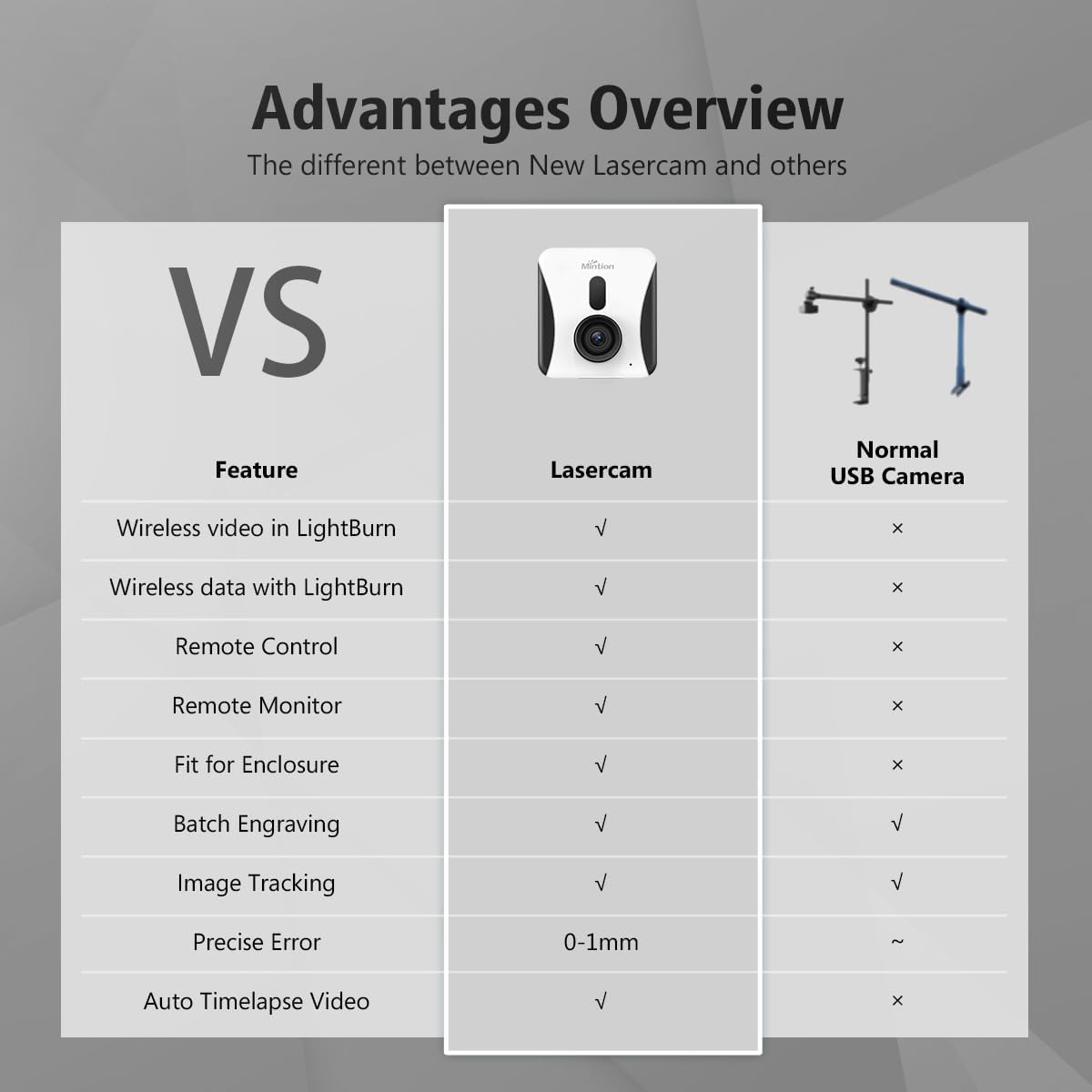 The new Mintion Lasercam, with its optimized positioning bracket and lens, suitable for most laser engraver enclosures. It compatible with major brands like Creality, xTool, Atomstack, Sculpfun, as well as most other diode laser engravers. Adheres to the GRBL protocol with LightBurn and LaserGRBL.
