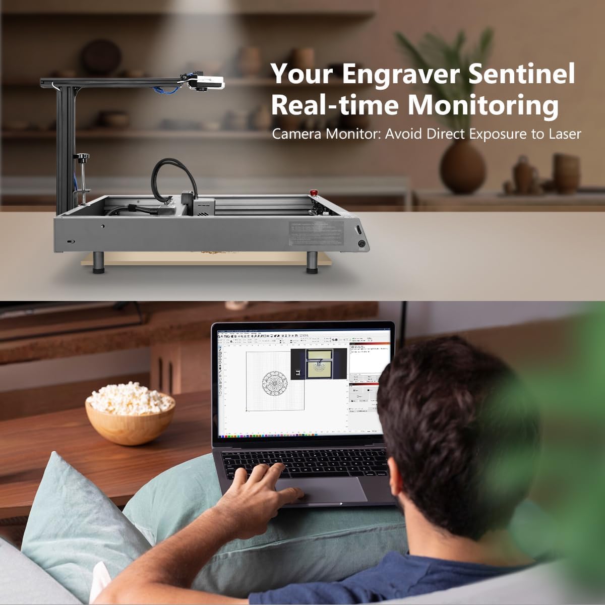 【Remote Monitoring and Control】This lightburn camera for laser engraver protect your eyes and gain freedom! Remotely monitor and control your engraving process via PC or phone, allowing you to view and manage your work from a distance. This lets you multitask while safeguarding your eyes from prolonged laser exposure and harmful fumes. (Note: Other standard USB cameras do not support remote viewing and control.)