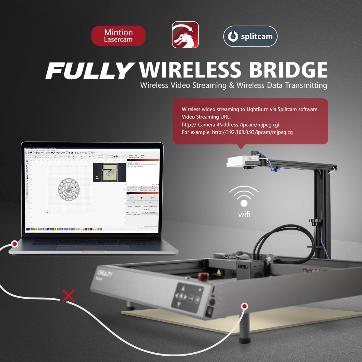 【LightBurn Software Wireless Bridge】Say goodbye to tangled cables and enjoy a tidy workspace. Supports wireless connections between the laser engraver and cutter machine and LightBurn, enabling seamless wireless engraving and cutting. It also allows wireless video streaming to LightBurn via Splitcam software, facilitating precise wireless positioning and tracking.